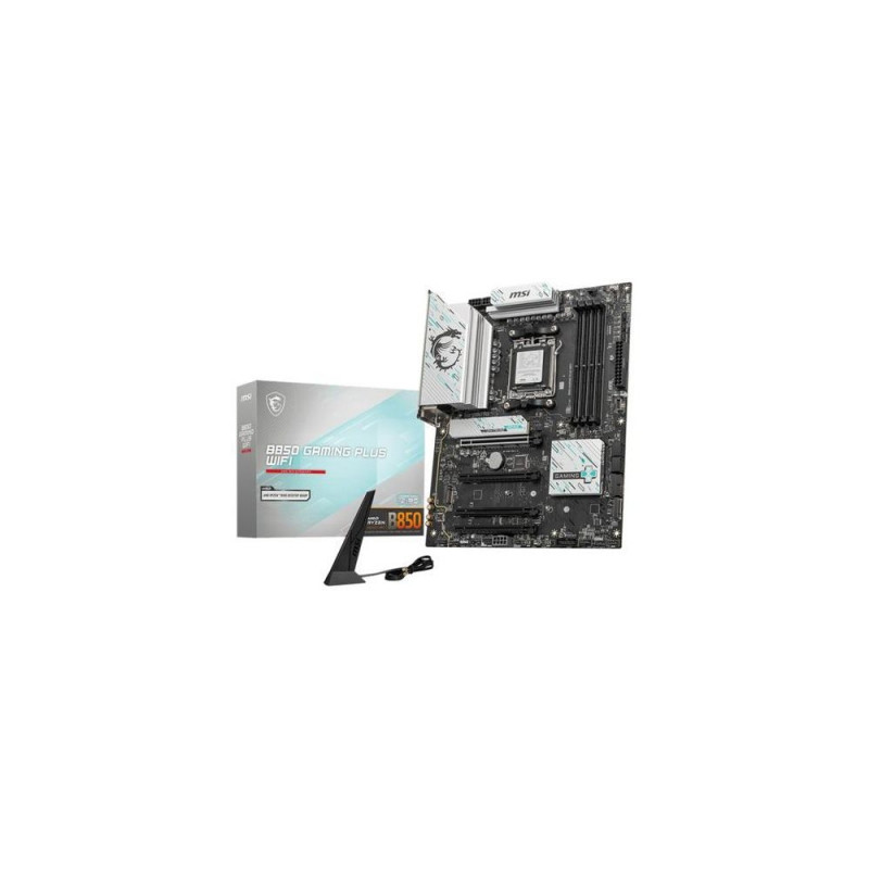 The B850 GAMING PLUS WIFI is crafted to offer extensive connectivity, versatile tools, and a premium Wi-Fi solution for gamers seeking a comprehensive experience. Featuring full-speed Wi-Fi 7, 5G LAN, PCIe 5.0 solution, Supplemental PCIe Power and exclusive EZ DIY features, it is ready for 24/7 non-stop gaming optimized for AMD Ryzen™ 9000 series processors.<br><br>MSI motherboards are designed with advanced hardware and technology, well-supporting the demanding computing usage of gaming and AI. Moreover, we also introduce AI to MSI Center and BIOS, making everything more effortless than before.<br><br><b>12+2+1 Duet Rail Power System</b><br>Unleash and sustain maximum performance with an aggressive VRM design built with digital CPU power system. Combining 8 + 8-pin power connectors and exclusive Core Boost technology, the B850 GAMING PLUS WIFI is ready to sustain heavy gaming loadings.<br><br><b>Extended Heatsink</b><br>Extended Heatsink enlarges the surface of heat dissipation and maintain the performance at heavy loads.<br><br><b>M.2 Shield Frozr</b><br>Strengthened M.2 thermal solution helps keep M.2 SSD safe and ensures incredible performance.<br><br><b>Heavy Plated VRM Heatsink</b><br>The VRM heatsink covers the upper MOS and helps dissipate the heat.<br><br><b>7W/mK Thermal Pad & Additional Choke Pad</b><br>High-quality 7W/mK MOSFET thermal pads and additional choke thermal pads ensure stable performance when all cores are running at high speed.<br><br><b>Enlarged Chipset Heatsink</b><br>The enlarged heatsink is designed to reduce dust and noise and capable of maintaining high efficiency of heat dissipation.<br><br><b>HIGH-BANDWIDTH AND LOW-LATENCY NETWORK</b><br>MSI's premium network solution provides incredible data transfer speed for demanding users.MSI B850 GAMING PLUS WIFI. Processor manufacturer: AMD, Processor socket: Socket AM5, Compatible processor series: AMD Ryzen 7000 Series, AMD Ryzen 8000 Series, AMD Ryzen 9000 Series. Supported memory types: DDR5-SDRAM, Maximum internal memory: 256 GB, Memory slots type: DIMM. Supported storage drive interfaces: M.2, Micro SATA III, Supported storage drive types: HDD & SSD, RAID levels: 0, 1. Ethernet interface type: 5 Gigabit Ethernet, Top Wi-Fi standard: Wi-Fi 7 (802.11be), Wi-Fi standards: 802.11a, 802.11b, 802.11g, Wi-Fi 4 (802.11n), Wi-Fi 5 (802.11ac), Wi-Fi 6 (802.11ax), Wi-Fi 6E.... Component for: PC, Motherboard form factor: ATX, Motherboard chipset family: AMD