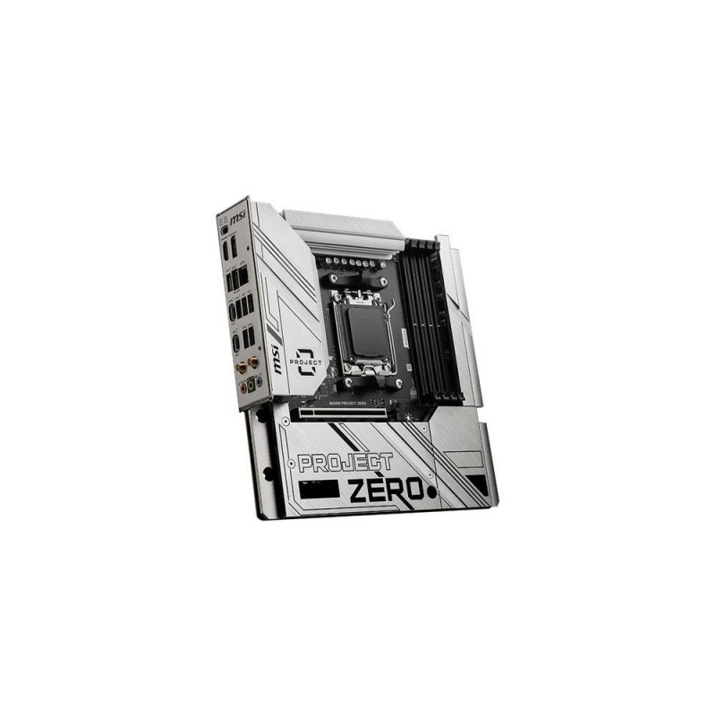 <b>ABSOLUTE SIMPLICITY</b><br>B650M PROJECT ZERO moves the power connectors, fan connectors, and other pin headers to the back of the motherboard. This provides a cleaner and neater front view, allowing the motherboard, liquid cooler, and graphics card's aesthetic design to be fully displayed.<br><br><b>LIGHTNING GEN 4 PCI-E</b><br>MSI lightning Gen 4 PCI-E represents the bandwidth of a x16 interface to 64GB/s that has doubled compared to its previous generation.<br><br><b>REINFORCED,</b><br><b>HEAVY SOLDERED CONNECTIONS</b><br>MSI PCI Express Steel Armor slots are secured to the motherboard with extra solder points and support the weight of heavy graphics cards. When every advantage in games counts, Steel Armor shields the point of contact from electromagnetic interference.MSI B650M PROJECT ZERO. Processor manufacturer: AMD, Processor socket: Socket AM5, Supported processor sockets: Socket AM5. Supported memory types: DDR5-SDRAM, Maximum internal memory: 128 GB, Memory channels: Dual-channel. Supported storage drive interfaces: M.2, PCI Express, Supported storage drive types: HDD & SSD, RAID levels: 0, 5, 10. Ethernet interface type: 2.5 Gigabit Ethernet, Top Wi-Fi standard: Wi-Fi 6E (802.11ax), Wi-Fi standards: 802.11a, 802.11b, 802.11g, Wi-Fi 4 (802.11n), Wi-Fi 5 (802.11ac), Wi-Fi 6 (802.11ax), Wi-Fi 6E.... Component for: PC, Motherboard form factor: micro ATX, Motherboard chipset family: AMD