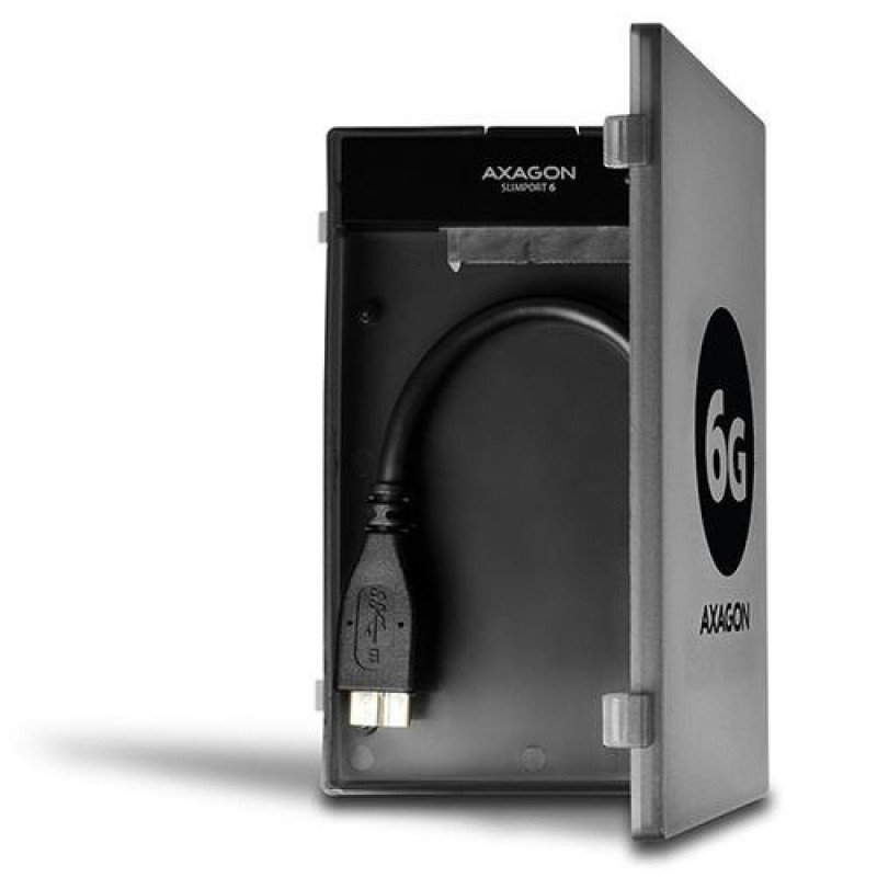 A compact AXAGON ADSA-1S6 SLIMport6 high-speed adapter with USB 3.0 and SATA 6G interface intended for easy connection of SSD or 2.5" SATA disk.<br><br>A handy tool to quickly connect a SSD or laptop disk, including boot support.<br><br>The UASP support significantly increases transmission rates especially when working with small files in the queue.<br><br>The TRIM feature support limits the gradual degradation of SSD performance over time.<br><br>Reading of S.M.A.R.T. information monitoring the condition of the connected disks. Supports spinning down of connected disks as well as an adapter.<br><br>The installation can be handled even by a layman - the disk connects to the adapter and the adapter to the computer's USB port; the rest is done automatically.<br><br>Minimum dimensions and weight, along with an enclosed disc case, make the product ideally suited even for mobile use.<br><br>Features:<br>• Compatible with USB 3.0 and backward compatible with USB 2.0.<br>• Supports transmission rates 12 / 480 / 5000 Mb/s (low / full / high speed).<br>• Supports 2.5" SATA III / II / I disks of all capacities.<br>• Compliant with Serial ATA 3.1 specification (SATA/600), transmission rates of up to 6 Gb/s.<br>• Compliant with Serial ATA 2.0 specification (SATA/300), transmission rates of up to 3 Gb/s (300 MB/s).<br>• Compliant with Serial ATA 1.0 specification (SATA/150), transmission rates of up to 1.5 Gb/s (150 MB/s).<br>• The total bandwidth / transmission rate of the adapter is determined by the USB 3.0 interface used (theor. 5 Gbit/s).<br>• Supports UASP (USB Attached SCSI Protocol) and BOT (Bulk-Only Transport).<br>• Supports booting from SSD/HDD connected via an USB adapter.<br>• HDD Auto Spindown - automatic spindown of a disk after period of inactivity lasting 22 minutes.<br>• HDD Turn Off - turns off the disk after removing the device or spinning down the PC.<br>• Possibility to connect your device while running thanks to the Hot Plug support.<br>• Full Plug and Play support.<br>• Connection via USB 3.0 micro B female connector.<br>• USB 3.0 cable USB 3.0 Type A male / USB 3.0 Type B male 10 cm long is included.<br>• Supplying the power via USB 3.0 bus up to 900mA from one USB port is sufficient in all cases.<br>• A blue LED indicating the connection to the computer's USB port (permanent light) and data transmission (blinking).<br>• Compact adapter dimensions 70 x 21 x 10 mm.<br>• Adapter weight only 11 g, weight of USB cable 18 g.<br>• Simple plastic case holds 2.5" disk max. 9.5 mm high with USB adapter connected (USB cable is led out through hole in the case).<br>• For thin 7mm SSDs/HDDs foam pads are included for better fit in the case.<br>• The case can also serve to transport or store the adapter itself without the disk, with the USB cable inside the case.<br>• Case dimensions 122 x 78 x 19 mm.<br>• Case weight 40 g.<br><br>Supported OSs:<br>• MS Windows XP / Vista / 7 / 8 / 8.1 / 10 and later, Windows Server 2003 / 2008 / 2012 / 2016 and later (supported are all 32- and 64-bit Windows OS versions), Mac OS X 10.x and higher, Linux with kernel 2.6.x and above.<br>• Note: Drivers are included with supported operating systems and are installed completely automatically. No other drivers need to be installed and are not even available. <br><br>Package contains:<br>• USB 3.0 - SATA 6G adapter,<br>• USB 3.0 cable 10 cm,<br>• plastic case for 2.5" disk and USB adapter,<br>• foam pads for 7 mm HDDs and SSDs,<br>• Packed in a cardboard box with the installation procedure included.Axagon ADSA-1S6. Product type: HDD/SSD enclosure. Number of storage drives supported: 1, Storage drive size: 2.5", Supported storage drive interfaces: Serial ATA, Serial ATA II, Serial ATA III. Data transfer rate: 5 Gbit/s. Hot-swap. Product colour: Black. USB connector type: USB Type-A