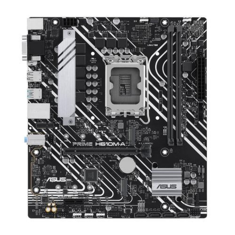 <br />ASUS PRIME H610M-A-CSM. Processor manufacturer: Intel, Processor socket: LGA 1700, Compatible processor series: Intel® Celeron®, Intel® Core™ i3, Intel® Core™ i5, Intel® Core™ i7, Intel® Core™ i9,.... Supported memory types: DDR5-SDRAM, Maximum internal memory: 96 GB, Memory slots type: DIMM. Supported storage drive interfaces: M.2, SATA III, Supported storage drive types: HDD & SSD. Ethernet interface type: Fast Ethernet, Gigabit Ethernet. Component for: PC, Motherboard form factor: micro ATX, Motherboard chipset family: Intel