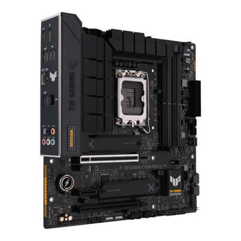 <b>TUF GAMING B760M-PLUS D4</b><br>TUF GAMING B760M-PLUS D4 takes all the essential elements of the latest Intel® processors and combines them with game-ready features and proven durability. Engineered with military-grade components, an upgraded power solution and a comprehensive cooling system, this motherboard goes beyond expectations with rock-solid performance for marathon gaming. TUF GAMING motherboards also undergo rigorous endurance testing to ensure that they can handle conditions where others may fail. Aesthetically, this model incorporates an embossed nameplate and geometric design elements to reflect the dependability and stability that defines the TUF GAMING series.<br><br><b>INTELLIGENT CONTROL</b><br>The TUF GAMING B760M motherboards pack flexible tools to tune every aspect of your system, enabling performance tweaks to expertly match the way you play.<br><br><b>All-Around Energy Efficiency</b><br>The Power Saving function contains several settings that can easily optimize power consumption and maximize energy savings. You can enable a CPU power limit, darken Aura lighting, and set the fan profile to a power saving mode. You can also toggle the Power Saver plan that is built into Microsoft Windows.<br><br><b>ROCK-SOLID PERFORMANCE</b><br>With upgraded power delivery and comprehensive cooling options to fuel the latest Intel CPUs, plus support for DDR4 memory and PCIe 4.0 storage, the TUF GAMING B760M-PLUS WIFI D4 is the perfect foundation for your next Intel battle rig.<br><br><b>DrMOS Power Stages</b><br>12+1 power stages combining high-side and low-side MOSFETS and drivers into a single package to deliver power, efficiency and stable performance for all compatible Intel processors.<br><br><b>EASY PC DIY</b><br>The TUF GAMING line offers easy setup for all builders. The TUF GAMING Alliance ecosystem grants compatibility, while Armoury Crate has Fan Xpert 2+, hardware info, Two-Way AI Noise Cancelation, RGB options and peripheral settings. This platform has intuitive tools to build and optimize dream rigs.<br><br><b>Build With Confidence</b><br>TUF GAMING Alliance is a collaboration between ASUS and trusted PC component brands to ensure compatibility across a wide range of parts, such as PC cases, power supplies, CPU coolers, memory kits and more. With new partnerships and components being added regularly, the TUF GAMING Alliance will continue to grow even stronger.<br><br><b>IMMERSIVE GAMING</b><br>TUF GAMING B760M motherboards provide a feature-packed high-performance gaming package, with ultrafast networking for smoother online gameplay, pristine audio with positional cues for FPS Gaming, and onboard RGB lighting that syncs with attached gear to personalize your gaming atmosphere.<br><br>ASUS Webstorage<br><b>Timeline Backup</b><br>Auto Backup for Your Computer!<br>ASUS user's special offer. Buy 1TB get 200GB free.ASUS TUF GAMING B760M-PLUS D4. Processor manufacturer: Intel, Processor socket: LGA 1700, Compatible processor series: Intel® Celeron®, Intel® Core™ i3, Intel® Core™ i5, Intel® Core™ i7, Intel® Core™ i9,.... Supported memory types: DDR4-SDRAM, Maximum internal memory: 128 GB, Memory slots type: DIMM. Supported storage drive interfaces: M.2, SATA III, Supported storage drive types: HDD & SSD, RAID levels: 0, 1, 5, 10. Ethernet interface type: 2.5 Gigabit Ethernet. Component for: PC, Motherboard form factor: micro ATX, Motherboard chipset family: Intel