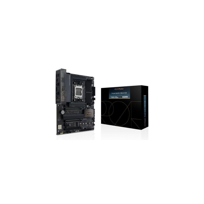 ProArt B650-Creator is an advanced motherboard designed for intensive content-creation workloads like virtual production, 3D rendering and 4K/8K video editing. It unleashes the performance of AMD Ryzen™ 7000 Series processors through robust power delivery and cooling design, and its comprehensive connectivity includes onboard 2.5 Gb and 1 Gb Ethernet, a USB 3.2 Gen 2x2 Type-C® front-panel connector with Quick Charge 4+, and DisplayPort™ via USB-C.<br><br>Comprehensive Connectivity<br><b>USB-C DisplayPort (DP Alt Mode)</b><br>This USB Type-C® port delivers transfer speeds of up to 10 Gbps, and it supports an alternate mode that provides DisplayPort™ 1.4 output for up to 8K resolution at 60 Hz. This new feature gives creators premium-grade flexibility to choose between high-speed data or an additional hi-res display*.<br>*This functionality requires the bundled DP-to-DP cable to be connected from an installed graphics card to the DP IN port located on the rear I/O panel of the motherboard.<br><br><b>USB 3.2 Gen 2x2 Type-C® front-panel connector with Quick Charge 4+</b><br>USB 3.2 Gen 2x2 boosts data transfers with speeds of up to 20 Gbps. This header also features Quick Charge 4+ technology that can quickly charge your pen display, tablet or mobile phone up to 60 watts by using a PCIe power supply cable plugged into the nearby 6-pin connector.<br><br><b>USB4® Support</b><br>ProArt B650-Creator features USB4® support via a Thunderbolt™ (USB4®) header. With an ASUS add-on card*, ProArt motherboards can enable bi-directional speeds of up to 40 Gbps on a single cable, while providing power to fast-charge device. Additionally, this card has a daisy-chain function for multi-screen connection and supports up to dual displays with 4K resolution.<br>*ASUS add-on card is sold separately.<br><br><b>Multi-card support</b><br>The ProArt B650-Creator supports multi-card configurations for expandability and flexibility in various professional workload scenarios such as 3D animation, video editing, audio production and SSD storage capacity upgrades.<br><br>Networking<br><br><b>Dual Ethernet</b><br>2.5 Gb and 1 Gb Ethernet provide fast data transfers simultaneously for internet and for local network-attached storage (NAS), allowing for improved data organization and security.<br><br><b>M.2 Slot (Key E)</b><br>ProArt B650-Creator features an M.2 slot (key E) which can support type 2230 WiFi/Bluetooth modules*.<br>*WiFi/BT modules are sold separately.<br><br><b>PCIe 5.0 M.2 Storage</b><br>The ProArt B650-Creator features three onboard M.2 slots, one of which is PCIe 5.0-ready to offer blistering 16 GB/s speed, while the remaining pair can still deliver massive 8 GB/s transfers through their PCIe 4.0 interfaces.<br><br>The core of your powerful workstation<br><br><b>Robust power design</b><br><br><b>12+2 teamed power stages</b><br>Rated for 60 amps and combining high-side and low-side MOSFETs and drivers into a single package, these stages deliver power and efficiency tailored for the latest AMD Ryzen 7000 series processors.<br><br><b>Digi+ power control</b><br>The ASUS Digi+ voltage-regulator module (VRM) is one of the finest in the industry and ensures ultra-smooth power delivery to the CPU.<br><br><b>ProCool power connectors</b><br>Built to tight specifications to ensure flush contact with PSU power lines. The resulting lower impedance helps to prevent hotspots and connector failure.<br><br><b>Chokes & capacitors</b><br>Superior alloy chokes and durable capacitors are engineered to resist extreme temperatures, providing a higher level of performance than the industry standard.<br><br><b>Performance boost</b><br>AMD Precision Boost Overdrive (PBO) pushes the CPU current and voltage budget to opportunistically increase performance. By aggressively tuning the PBO parameters, AMD’s algorithm can leverage the motherboard’s robust power solution to ramp up performance even higher.<br><br><b>Memory</b><br>The ProArt B650-Creator enhances DDR5 performance by providing overclocking options that would otherwise be locked, whether you’re dealing with high-speed or entry-level memory modules.<br><br><b>DDR5 Strength</b><br>For those who want to fly past stock DDR5 speeds, the ProArt B650-Creator is ready for enthusiast-grade kits, courtesy of vast AMD EXtended Profiles for Overclocking (EXPO) support. Seasoned veterans can further tweak performance via an extensive array of settings in the UEFI.<br><br><b>AEMP</b><br>ASUS Enhanced Memory Profile (AEMP) is an exclusive firmware feature for PMIC-restricted memory modules. AEMP automatically detects the memory chips on your kit and then presents optimized frequency, timing and voltage profiles that you can effortlessly apply to unleash performance.<br><br><b>Flexible Air- and Liquid-Cooling Controls</b><br>ASUS Fan Xpert 4 software provides comprehensive control over fans, water pumps and all-in-one (AIO) coolers. Whether cooling with air or water, an Auto-Tuning mode intelligently configures all parameters with a single click. There’s also an Extreme Quiet mode that reduces all fan speeds to below the default minimum to keep your system whisper-quiet when performing light tasks. Fans, water pumps and AIO coolers can also be controlled via the UEFI BIOS.<br><br>Everything you need to optimize workflow<br><br><b>Two-Way AI Noise Cancelation</b><br>As working from home becomes the new normal, clear online communication is more critical than ever. Two-Way AI Noise Cancelation is an audio utility that leverages a massive deep-learning database to reduce background noise from the microphone* and incoming audio. Distracting keyboard clatter, mouse clicks and other ambient noises are smartly pared back so your calls and video conferences with partners and clients are crystal clear.<br><br><b>Customize your personal settings</b><br>ProArt Creator Hub is your personal portal to monitor your PC status, personalize settings or optimize your workflow. It featur