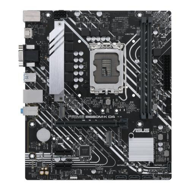 ASUS Prime series motherboards are expertly engineered to unleash the full potential of 12th Generation Intel® processors. Boasting a robust power design, comprehensive cooling solutions and intelligent tuning options, Prime B660M-K D4 provides users and PC DIY builders a range of performance tuning options via intuitive software and firmware features.<br><br><b>FLEXIBILITY</b><br>Comprehensive controls form the foundation of the ASUS Prime series. The Prime B660 motherboard packs flexible tools to tune every aspect of your system, enabling performance tweaks to perfectly match the way you work to maximize productivity.<br><br><b>Intelligent Control</b><br><b>All-Around Energy Efficiency</b><br>The Energy Processing Unit (EPU) automatically optimizes power consumption and maximizes energy savings with Away mode — a smart setting that creates an extreme energy-saving scenario by shutting down unused I/O controllers.<br><br><b>Flexible Air- and Liquid-Cooling Controls</b><br>ASUS Fan Xpert software provides comprehensive control over fan. There’s an Extreme Quiet mode that reduces fan speeds to below the default minimum to keep your system whisper-quiet when performing light tasks. Fan can also be controlled via the UEFI BIOS.<br><br><b>Precise Digital Power Control</b><br>The Digi+ voltage-regulator module (VRM) delivers real-time control over voltage droop, automatically switching frequency and power-efficiency settings. It also allows you to fine-tune your CPU for ultimate stability and performance.<br><br><b>UEFI BIOS</b><br>The renowned ASUS UEFI BIOS provides everything you need to configure, tweak and tune your system. It offers intelligently simplified options for PC DIY beginners, as well as comprehensive features for seasoned veterans.<br><br><b>Advanced Tuning for Serious Tweakers</b><br>An intuitive Advanced mode offered via the UEFI lets you take complete control. A built-in search feature makes it easy to find options, and various advanced functions let you intelligently make nuanced adjustments so you can dial in performance just the way you want.<br><br><b>Quick and Simple Setup</b><br>EZ mode displays vital settings and stats and also offers guided wizards, drag-and-drop functionality, and one-click application of important settings — all to help you get your rig up and running in no time.<br><br><b>Intuitive Graphical Fan Control</b><br>Fine-tune individual fan settings simply by dragging a curve with the mouse.<br><br><b>EZ XMP</b><br>Improve DRAM performance with one click.<br><br><b>COOLING</b><br>Prime B660 series are engineered with multiple onboard heatsinks and an array of hybrid fan headers to ensure your rig stays cool and stable under intense workloads.<br><br><b>Heatsinks<br>VRM Heatsink and Thermal Pad</b><br>VRM heatsink and thermal pad improve heat transfer from the MOSFETs and chokes for better cooling performance.<br><br><b>Cooler by Design</b><br>Prime B660 series feature comprehensive cooling controls that are configurable via Fan Xpert software or via the UEFI BIOS.<br><br><b>Multiple Temperature Sources</b><br>Each header can dynamically reference three thermal sensors. Fan Xpert allows you to map the temperature of supported ASUS graphics cards to optimize cooling for GPU- and CPU-intensive tasks.<br><br><b>PERFORMANCE</b><br>Prime B660 series are built to handle the additional cores and increased bandwidth of 12th Generation Intel® processors. ASUS B660 motherboards provide all the fundamentals to boost daily productivity, so your system will be ready for action with stable power, intuitive cooling and flexible transfer options.<br><br><b>Power Design</b><br>Stable power is essential to extract every last bit of performance out of 12th Generation Intel processors. Prime B660M-K D4 is geared to cater to the demands of these high-core-count CPUs.<br><br><b>ProCool Connectors</b><br>Proprietary connectors augment the motherboard's link to the PSU with 8 pin connectors that pass 12 volts of power directly to the processors. Each jack features solid pins that can handle more current than hollow-pin connectors.<br><br><b>6+1+1 Power Stages</b><br>A VRM with 6+1+1 Power Stages delivers the power and efficiency that the latest Intel processors demand.<br><br><b>DDR4 5333(OC)</b><br>Improvements to trace routing design provide the latest Intel processors with enhanced access to memory bandwidth. ASUS technology carefully maps memory signal pathways across different PCB layers to reduce path distance, and it adds shielding zones that significantly reduce crosstalk.<br><br><b>Storage<br><br>Two M.2 slots (up to 64 Gbps)</b><br>Prime B660M-K D4 offers a total of two M.2 slots that support data-transfer speeds of up to 64 Gbps via PCIe® 4.0, enabling quicker boot-up and app load times with OS or application drives.<br>* Actual transmission speeds will be lower than the theoretical maximum speed.<br><br><b>Connectivity</b><br><b>PCIe® 4.0 Slot</b><br>Prime B660M-K D4 is designed specifically for 12th Generation Intel® CoreTM CPUs and offer PCIe® 4.0 connectivity. The wide bandwidth and superfast transmission speeds allow you to create feature-rich builds that can handle high loads effortlessly.<br><br><b>Realtek 1 Gb Ethernet</b><br>Realtek 1 Gb Ethernet reduces CPU overhead and offers exceptionally high TCP and UDP throughput for faster, smoother data transfer.<br><br><b>Audio<br>Combined onboard features deliver elevated audio</b><br>Intelligent design and premium hardware create audio quality unlike anything you’ve ever experienced.<br><br><b>Audio Shielding</b><br>Separates analog/digital signal domains, significantly reducing multi-lateral interference.<br><br><b>Separate Layer for Left and Right Tracks</b><br>Ensures minimal crosstalk between audio paths.<br><br><b>Premium Audio Capacitors</b><br>Premium parts provide an immersive sound signature, with exceptional fidelity.<br><br><b>Lighting Control<br>Brighten Up Your Build</b><br>With 5050 R
