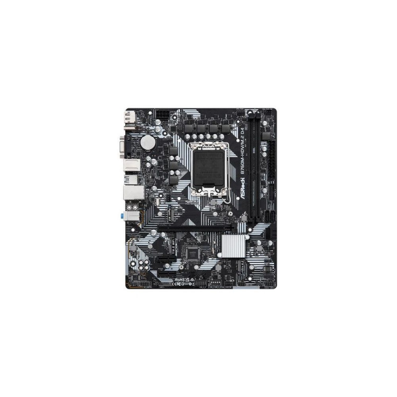 <b>5+1+1 Power Phase Design</b><br>Featuring sturdy components and completely smooth power delivery to the CPU, offering enhanced performance for gamers.<br><br><b>High Speed M.2 Solution(PCIe Gen4 x4)</b><br>Supports PCI Express 4.0 M.2 SSDs, it is capable of perform twice the speed compared to previous 3rd generation, giving a lightning fast data transferring experience.<br><br><b>M.2 (KEY E) For WiFi</b><br>Besides the onboard LAN port, users may also choose 802.11ac wireless connections by M.2 (Key E) slot.<br><br><b>3 Graphics Outputs</b><br>Complete with all three types of most used connectors! Packed with a D-Sub + DisplayPort + HDMI combo.<br><br><b>Auto Driver Installer</b><br>No need to worry about lack of disk drive! Asrock preinstall LAN driver to ensure that you are able to install all drivers needed in an easier way than using SCD.<br><br>Asrock B760M-HDV/M.2 D4. Processor manufacturer: Intel, Processor socket: LGA 1700, Compatible processor series: Intel® Core™ i3, Intel® Core™ i5, Intel® Core™ i7, Intel® Core™ i9. Supported memory types: DDR4-SDRAM, Maximum internal memory: 64 GB, Memory slots type: DIMM. Supported storage drive interfaces: M.2, SATA III, RAID levels: 0, 1, 5, 10. Ethernet interface type: Gigabit Ethernet, LAN controller: Realtek RTL8111H. Component for: PC, Motherboard form factor: micro ATX, Motherboard chipset family: Intel