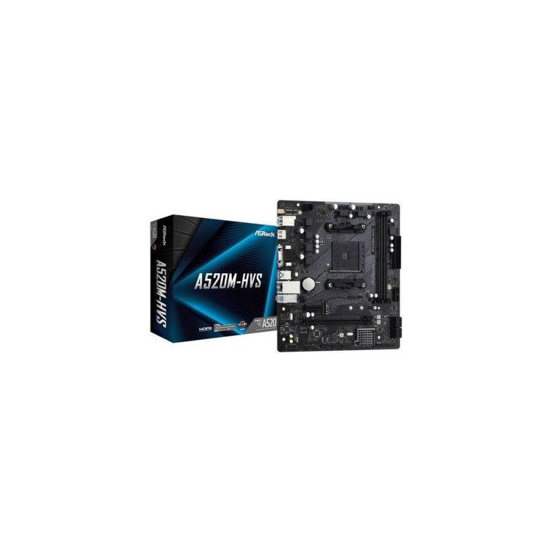 <b>A520 MOTHERBOARD FOR EVERYONE</b><br>All Essentials You Need For Computing<br><br><b>Ultra M.2 32Gb/s (PCIe Gen3 x4 & SATA3)</b><br>The PCIe Gen3 x4 Ultra M.2 interface pushes data transfer speeds up to 32Gb/s. In addition, it also supports SATA3 6Gb/s M.2 modules.<br><br><b>HDMI 4k @60Hz</b><br>Supports the most recent HDMI 4K 60Hz graphics output specification. With the larger bandwidth and increased frame rate, the motion on your screen becomes more fluid and less blurry.<br><br><b>Dual Graphics Outputs</b><br>Complete with two types of most used connectors! Packed with a D-Sub + HDMI combo, you have more graphics output options now.<br><br><b>Full Spike Protection</b><br>Some sensitive digital components on the motherboard are vulnerable to power surges, the excessive current may cause your system to malfunction immediately. ASRock Full Spike Protection includes various technologies to prevent your motherboard’s components from being damaged by these unexpected voltage spikes.<br><br><b>Live Update & APP Shop</b><br>ASRock Live Update & APP Shop is designed for your convenience. We provide various apps and support software for users to download. You can also easily optimize your system and keep your motherboard up to date with ASRock Live Update & APP Shop.Asrock A520M-HVS. Processor manufacturer: AMD, Processor socket: Socket AM4, Compatible processor series: AMD Ryzen 3000 Series. Supported memory types: DDR4-SDRAM, Maximum internal memory: 64 GB, Memory slots type: DIMM. Supported storage drive interfaces: M.2, SATA III. Graphics card family: AMD, Graphics card: Radeon Vega. Ethernet interface type: Gigabit Ethernet, LAN controller: Realtek RTL8111H