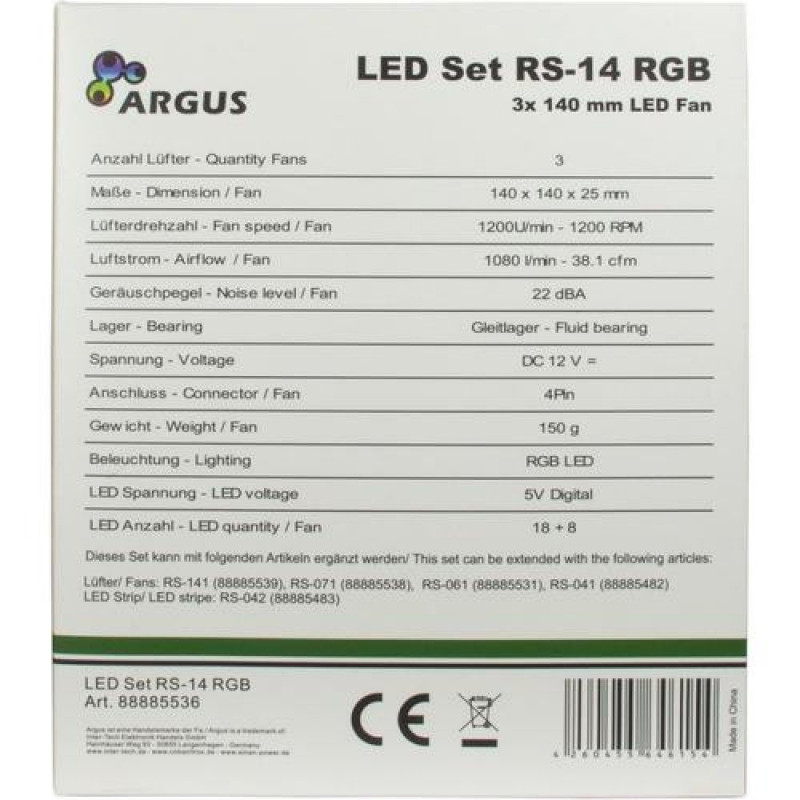 <b>Argus RGB-Fan Set RS-14 – makes your world more colorful!</b><br>The three 4pin PWM 140mm RGB fans from Argus provide great lighting for your PC case and provide over 300 different effects and modes with the included wireless remote control and control unit. If that's not enough, you can also use the integrated 5V RGB header (addressable RGB LEDs) to synchronously manage and control all RGB LEDs via the motherboard.<br>Each of the 26 integrated RGB LEDs per 140mm fan are the guarantee for extraordinary lighting effects. Rubber-coated pads underneath the mounting holes reliably prevent the fans from transmitting vibration to the PC case, ensuring smooth operation at up to 1200 rpm and 22 dBA.<br>The set can easily be extended with up to five additional optional Argus RGB fans and two optional Argus RS-042 RGB LED strips.<br> <br>Inter-Tech Argus RGB-Fan Set RS-14. Type: Fan, Fan diameter: 14 cm, Rotational speed (max): 1200 RPM, Noise level (high speed): 22 dB, Airflow: 64.73 m³/h. Product colour: Black