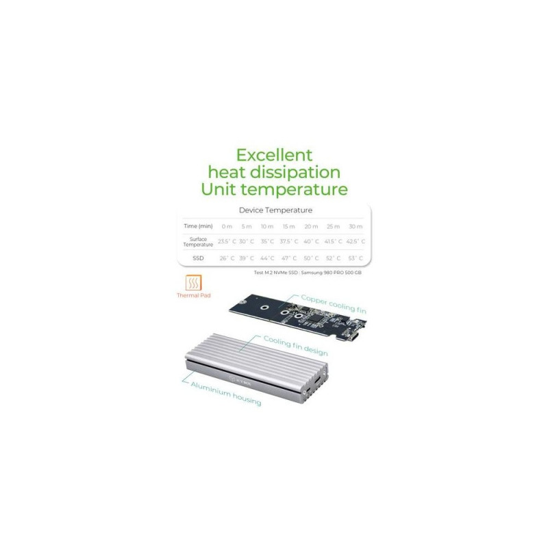 <b>Perfect cooling</b><br>The patented cooling plate transfers the resulting waste heat from the SSD to the housing and cools the SSD down optimally. This prevents the otherwise usual early reduction of the transfer rate to protectOsta kohe, viimased eksemplarid laos!