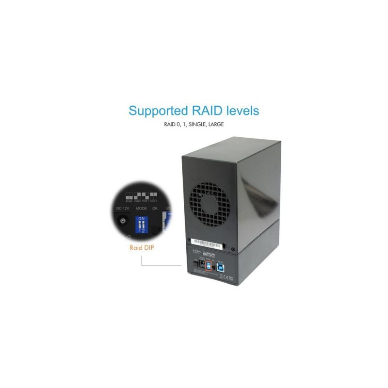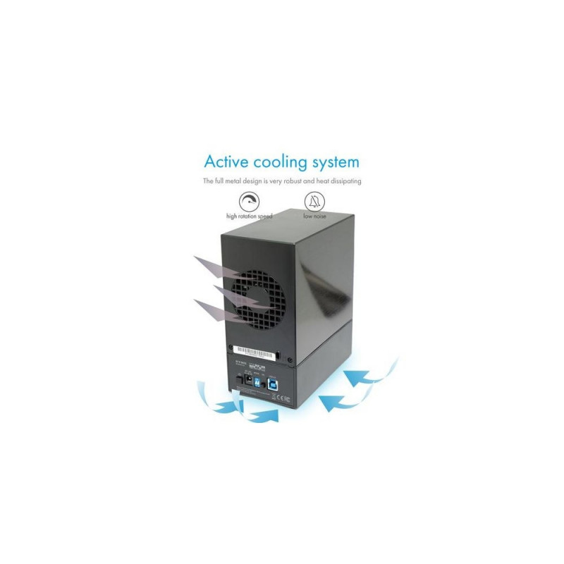 <b>A RAID for any case</b><br><br>The use of two hard as a RAID array is popular and well spread thanks to many advantages. But whoever wants to take this advantage, often can not do it due to the fact that not every motherboard is equipped with a RAID controller and laptops usually fall per-se outside the scope of possibilities. That is where the ICY BOX IB-RD3621U3 comes to help and converts two 3.5" SATA hard disks effectively to a high-performance RAID array. The exchange of HDDs is made easy thanks to EasySwap.<br><br>The given choices are Single, RAID 0, LARGE and RAID 1. So either higher speed data transmission, data mirroring for more reliability, a detection of the HDDs as individual drives or both HDDs are displayed as one huge drive. RAID 0 is particularly interesting, fueled by the modern USB 3.0 port - here the transfer rates reach up to 5 Gb per second. The hard disks are honored with a longer life span due to the lower operating temperatures because a 6 cm fan is actively assuring enough cool air.<br><br><b>Have the pleasure - twice!</b><br><br>Two hard disks in the form factor 3.5" fit into this RAID enclosure. Available RAID modes are single, RAID 0, 1 and LARGE. So that this candidate is beautifully versatile and is prepared for any situation.<br><br><b>Name is program</b><br><br>The IB-RD3621U3 is made of light plastic. Since raiding is very heavy on the HDDs a lot of heat is produces, the fan on the back of the enclosure is capable of cooling the HDDs very well.<br><br><b>Energy effecient</b><br><br>Thanks to the On/Off switch, the IB-RD3621U3 is a true energy saver. What is likewise well controlled are rapid data transfer via USB 3.0 connection. If desired, the hard disks are very easy to replace thanks to HotSwap and plug & play.ICY BOX IB-RD3621U3. Product type: HDD/SSD enclosure. Number of storage drives supported: 2, Storage drive size: 3.5", Supported storage drive interfaces: Serial ATA, Serial ATA II, Serial ATA III. Data transfer rate: 5 Gbit/s. RAID levels: 0, 1, Hot-swap. Product colour: Black. USB connector type: USB Type-B
