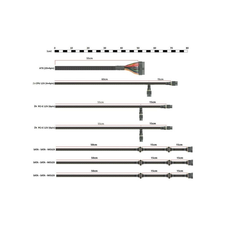 - 3x Molex pistik (3-l 80 cm pikkusel kaablil, lamedad mustad, jagatud SATA-ga)