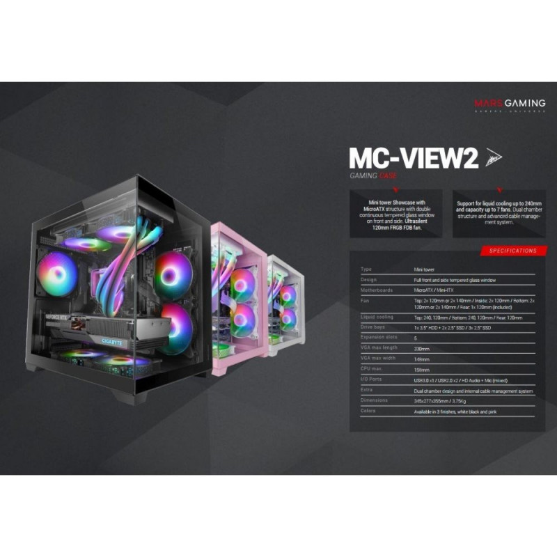 he MC-VIEW2 mini-tower combines cutting-edge design and advanced performance in a compact format. Its continuous tempered glass on the front and side panels provides a panoramic view of the interior, showcasing every component with a flawless aesthetic. Pre-installed with a 120mm rear FRGB fan, it ensures efficient cooling right out of the box. Additionally, its internal cable management system, compatibility with up to 240mm liquid cooling, and support for up to 7x 120mm fans guarantee optimized airflow, keeping your setup organized and efficient.
