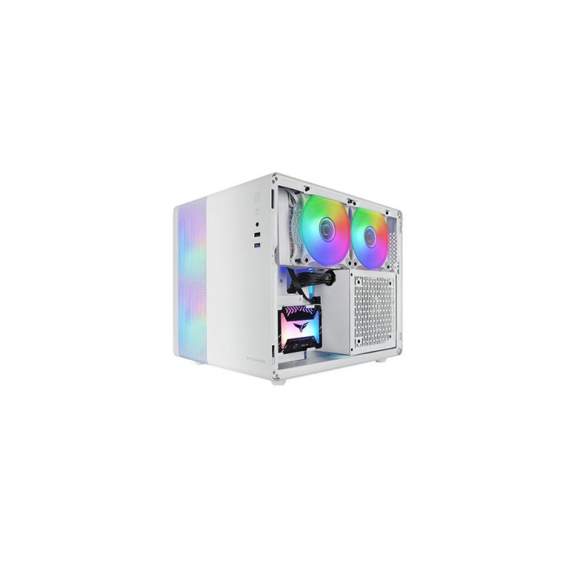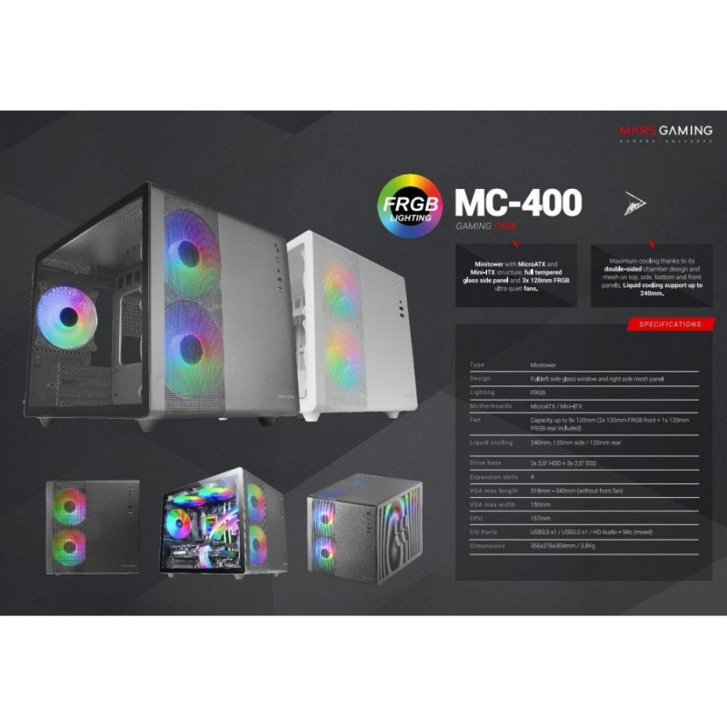Experience the fusion of innovation and compact design with this full-metal gaming case, specifically engineered for advanced configurations in Micro-ATX and Mini-ITX formats. This unique case features a double-sided chamber design, built-in triple FRGB cooling, a full tempered glass window and a full mesh side panel for a sleek and modern aesthetic. It also supports internal liquid cooling up to 240mm, uniquely positioned in the second chamber for optimal heat dissipation, ensuring your components stay cool even during intense gaming sessions. This compact yet powerful solution is designed to meet the demands of today's high-performance gaming systems.