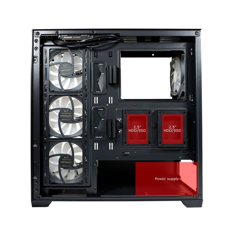LC-Power LC-715B-ON. Vormifaktor: Midi Tower, Tüüp: PC, Toote värvus: Must. Toiteallika paigutus: Taga, Toetatud toiteallika vormifaktorid: ATX. Toetatud tagumise ventilaatori läbimõõt: 120 mm, Toetatud ülemiste ventilaatorite läbimõõt: 120, 140 mm, Toetatud alumiste ventilaatorite läbimõõt: 120 mm. Laius: 220 mm, Sügavus: 445 mm, Kõrgus: 455 mm