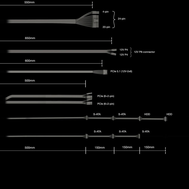 - PCIe ühendused: 2 x PCIe 6+2-pin, 1 x PCIe 5.0 12VHPWR