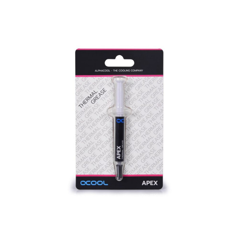 Alphacooli Apex Thermal Grease'ile on äärmiselt kõrge soojusjuhtivus, mis teeb sellest ühe kõige parema jõudlusega termopasta turul. Paremat soojusjuhtivust pakuvad ainult vedelate metallide termopastad. Apex Thermal Grease tarnitakse 4g aplikaatoris koos kruvikorgiga. Termopasta kogusest piisab mitmeks rakenduseks ja seda saab aplikaatoris kuivamise eest kaitstult säilitada. Lisaks on Apex Thermal Grease mittejuhtiv ja mittesöövitav. Kui väike kogus pastat lekib pealekandmise ajal, on riistvara kahjustamine väga ebatõenäoline.