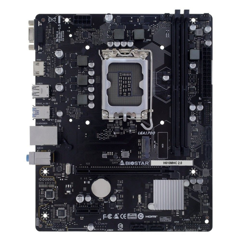 Biostar H610MHC 2.0. Protsessoritootja: Intel Protsessori sokkel: LGA 1700 Ühilduvad protsessorid: Intel® Celeron®, Intel Core i3 12. põlvkond, Intel Core i3 13. põlvkond, Intel Core i3 14. põlvkond, Intel... Toetatud operatiivmälu: DDR4-SDRAM Maksimaalne RAM-mälu: 64 GB Mälutüüp: DIMM Toetatud andmekandjate liidesed: M.2, SATA III Toetatud andmekandjad: HDD ja SSD Etherneti liidese tüüp: Gigabit Ethernet LAN-kontroller: Realtek RTL8111H Komponent: PC jaoks Emaplaadi vormitegur: micro ATX Emaplaadi kiibistiku perekond: Intel
