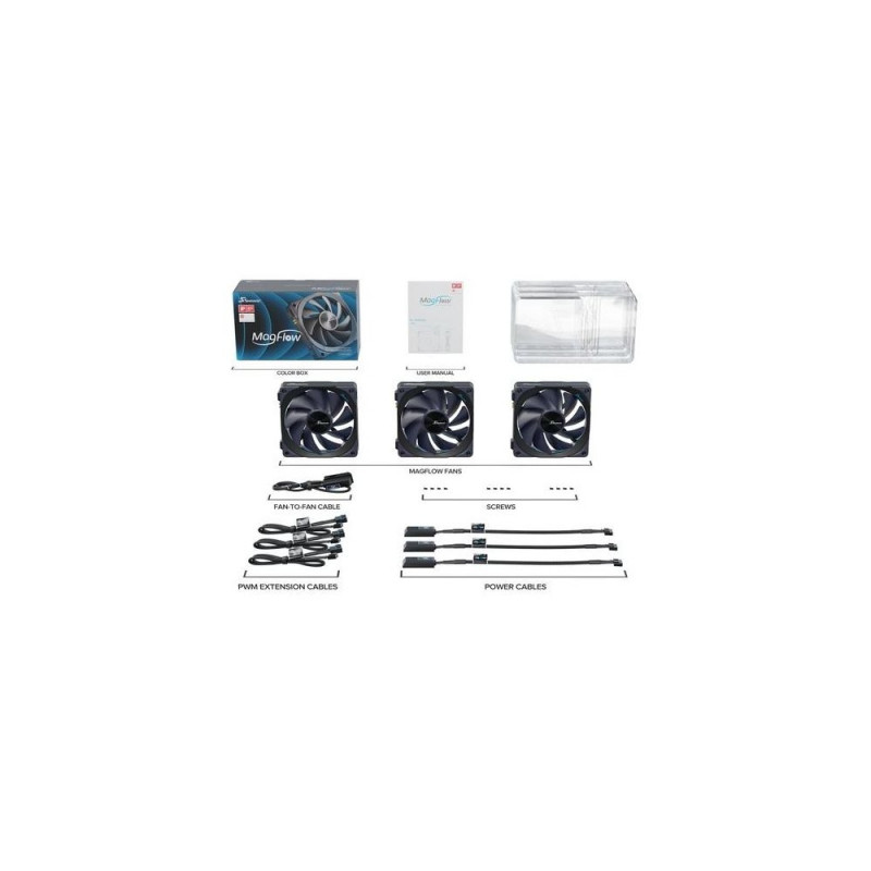 Thanks to the very innovative magnetic connection system, the installation of new MagFlow fans will be fast and effortless. Customers will have the choice to purchase single fan kits or a 3-Fan kit, depending on their needs to create the most efficient cooling for the PC components or radiators.<br><br><b>DAISY CHAIN DESIGN</b><br>Individual fans are attached to each other by an interlocking mechanism supported by magnets. This system eliminates the use of wires to make the installation simpler and cleaner.<br><br><b>MODULARITY</b><br>Regardless of the number of fans to be installed, attaching the cables for power and signal becomes extremely easy and convenient with the magnets. The connectors snap quickly and precisely in place, which greatly simplifies the assembly process.<br><br><b>EASY INSTALLATION ON TOP OF THE RADIATOR</b><br>After the fans are connected, they can be installed on top of the water-cooling radiator with only four screws, which reduces the time spent on alignment and screw locking.Seasonic MagFlow 3-Fan Kit. Type: Fan, Fan diameter: 12 cm, Rotational speed (min): 600 RPM, Rotational speed (max): 2000 RPM, Maximum air pressure: 2.61 mmH2O, Bearing type: Fluid Dynamic Bearing (FDB). Voltage: 12 V. Width: 124.2 mm, Depth: 26.6 mm, Height: 120.4 mm. Product colour: Black