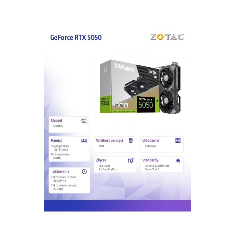 ZOTAC GAMING GeForce RTX 5050 Twin Edge OC on kompaktne graafikakaart, mida toidab NVIDIA tipptasemel Blackwelli arhitektuur, DLSS4 ja 8 GB GDDR6 mälu. Tehases ülekiirendatud Twin Edge OC on valmis pakkuma sujuvaid kaadrisagedusi ja suurepärast jõudlust kõikides mängudes.