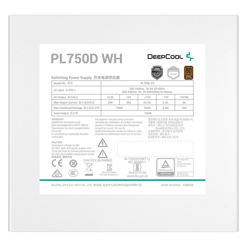 DeepCool PL750D WH. Koguvõimsus: 750 W, vahelduvvoolu sisendpinge: 100–240 V, vahelduvvoolu sisendsagedus: 50/60 Hz. Emaplaadi ühenduspistik: 20+4 pin ATX, kaablitüüp: mittemodulaarne. Otstarve: PC, toiteploki (PSU) vormitegur: ATX, 80 Plus sertifikaat: 80 PLUS Bronze. Toote värvus: valge, jahutus: aktiivne, ventilaatori läbimõõt: 12 cm. Vastavussertifikaadid: RoHS, WEEE, sertifikaadid: CE/FCC/CCC/RCM/EAC/CAN ICES-003(B)/NMB-003(B)/TUV-RH