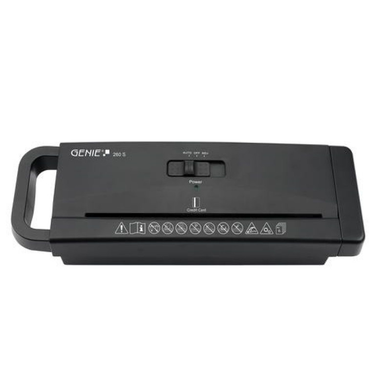 Reliable strip cut shredder in attractive black design for up to 6 sheets of DIN A4 (80g / m²) or one credit card per work. Entry device (without basket) suitable for all paper baskets from 32 cm up to 39 cm diameter<br>With automatic start / stop function, main switch on the shredder: Auto / Off / Reverse, overload protection<br>Papier shredder - Cutting size: approx. 6 mm wide strips; Feeding speed: 2.50 m / min (with 6 sheets), input opening for paper: 220 mmGenie 260 S. Shredding type: Strip shredding, Shredding size: 6 mm, Noise level: 73 dB. Width: 334 mm, Depth: 113 mm, Height: 72 mm