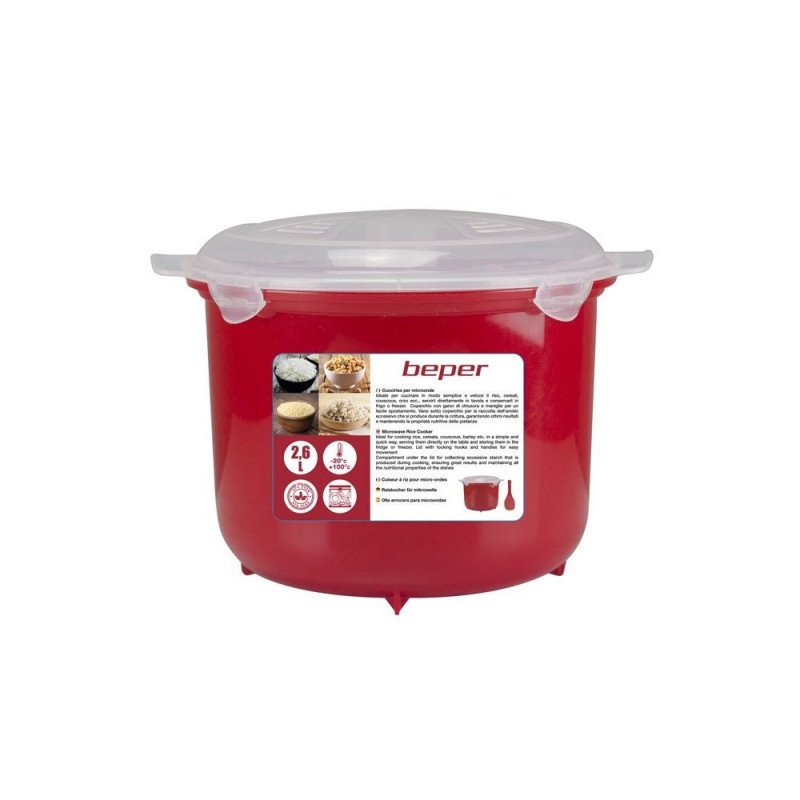 Beper C106CAS001 Mikrolaineahi riisikeetjaIdeaalne riisi, teravilja, kuskussi, odra jms lihtsaks ja kiireks keetmiseks, otse lauale serveerimiseks ja külmkapis või sügavkülmas hoidmiseks. Lukustuskonksude ja käepidemetega kaas lihtsaks liigutamiseks Kaane all olev sahtel toiduvalmistamisel tekkiva liigse tärklise kogumiseks, tagades suurepärase tulemuse ja säilitades kõik roogade toiteomadused. Kaasas nõudepesumasinas pestav ja serveerimislabidas.Toote suurus: 21,4 x 19 x 16 cm Materjal: BPA vaba polüpropüleen