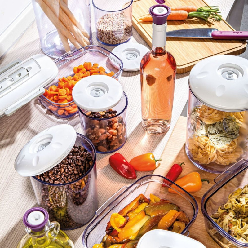 The MAGICVAC New Family Line vacuum container set enables food to be preserved and stored. It consists of three different sized containers, ideal for dry, delicate, powdered, fresh or pureed food. The containers are made from phthalate- and bisphenol-free materials, are dishwasher-safe and freezer-safe. They offer safe and long-lasting preservation. The set contains three containers with easy-to-clean lids that are microwave-safe. All containers are dishwasher safe and can be cleaned on the top shelf.