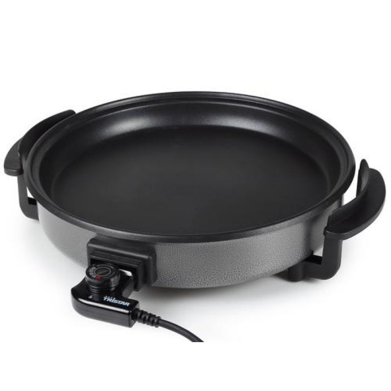 PZ-2694 Electric Pan – Diameter 40 centimetres – Maximum 280⁰ C<br>The PZ-2964 electric pan is a large, versatile electric pan that can be used for various purposes. You can easily set the desired temperature up to a maximum of 280⁰ C. The electric pan is also suitable to use whilst camping.<br><br>Easy to control<br>The electric pan has 1500 Watt power with which the pan reaches the desired temperature quickly. The electric pan has a maximum temperature of 280⁰ C. It is provided with five different temperature settings to adjust the temperature to your own preferences. The indicator light shows you at a glance if the right temperature has already been reached.<br><br>Very versatile<br>The electric pan can be used for all different kinds of purposes. You can use the electric pan while camping so you can use an extra pan that you can even use to bake a pizza or make a tortilla. You can cook a delicious casserole or keep snacks warm during a party. The non-stick coating makes sure your food will not stick to the pan.<br><br>Practical to use<br>The electric pan is provided with different features that provide extra ease of use. The pan features a large volume with a diameter of 40 centimetres. It is provided with integrated handles to move the pan easily and safely. Furthermore, it is provided with an adjustable thermostat on a removable power cord. The electric pan stands stable on the counter top thanks to its nonslip feet. The transparent lid with steam exhaust allows you to keep an eye on your food while it is cooking.<br><br>offers you 24 months warranty on all products.<br><br>What’s in the box:<br>electric pan, lid with steam exhaust, detachable power cord, instruction manual<br><br>Reasons to choose the PZ-2694 Electric Pan:<br>The electric pan is versatile and practical thanks to its diverse possibilities<br>Large size thanks to a diameter of 40 centimetres so you have lots of space<br>Easily set the desired temperature thanks to five different temperature settings<br>Practical design with integrated handles, detachable cord and transparent lid with steam exhaust<br>The electric pan heats up quickly thanks to 1500W powerTristar PZ-2964 Multifunctional grill pan. Shape: Round, Product colour: Black, Temperature (max): 280 °C. Power: 1500 W. Diameter: 40 cm, Weight: 3.5 kg, Package width: 395 mm. Products per pallet: 48 pc(s)