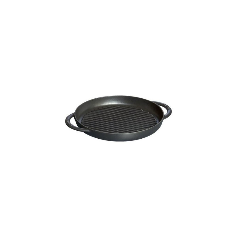 This STAUB grill pan makes meat crispy on the outside and juicy on the inside. Excess fat drips between the grooves in the base, so that you can prepare low-fat and therefore low-calorie dishes in this cast iron pan. The round grill pan from STAUB is particularly practical to use thanks to its two handles. The black grill pan has a diameter of 26 cm and a flat edge with a height of 3.5 cm. It is enamelled on the inside to further enhance the good frying effect of cast iron. And the natural flavour of meat unfolds particularly well on enamel. Enamel is also highly scratch-resistant and robust. This pan can be left on the hob after use to keep food hot. This means that every guest can serve themselves and take a delicious piece of meat, fish or vegetables from the pan.<br><br><b>VEGETABLES?</b><br>The grill pan is not only suitable for conventional grilling of meat or fish – fresh vegetables can be grilled full of flavour and then served in it too.<br><br><b>FOOD SAFELY IN HAND</b><br>Thanks to the two handles on the sides, the pan can be moved easily and safely - whether used on the hob or in the oven.<br><br><b>CREATES TEXTURE</b><br>The grooves in the base of the pan create the classic grill marks – and excess grease can collect there too for low-fat grilling.ZWILLING STAUB. Shape: Round, Type: Grill pan, Product colour: Black. Diameter: 26 cm, Bottom diameter: 23.5 cm, Width: 260 mm. Quantity per pack: 1 pc(s)