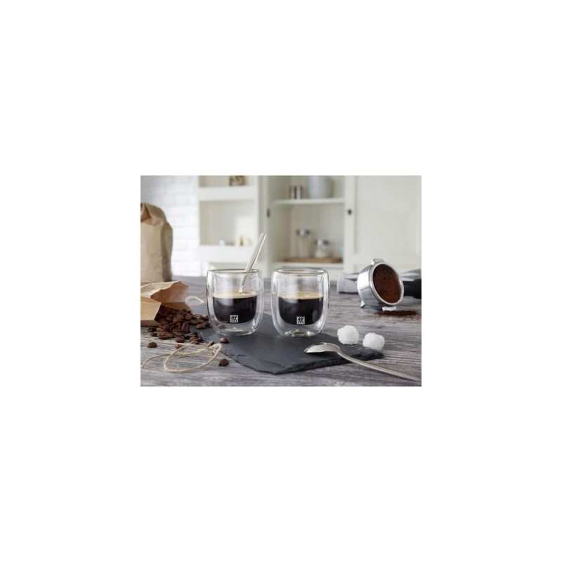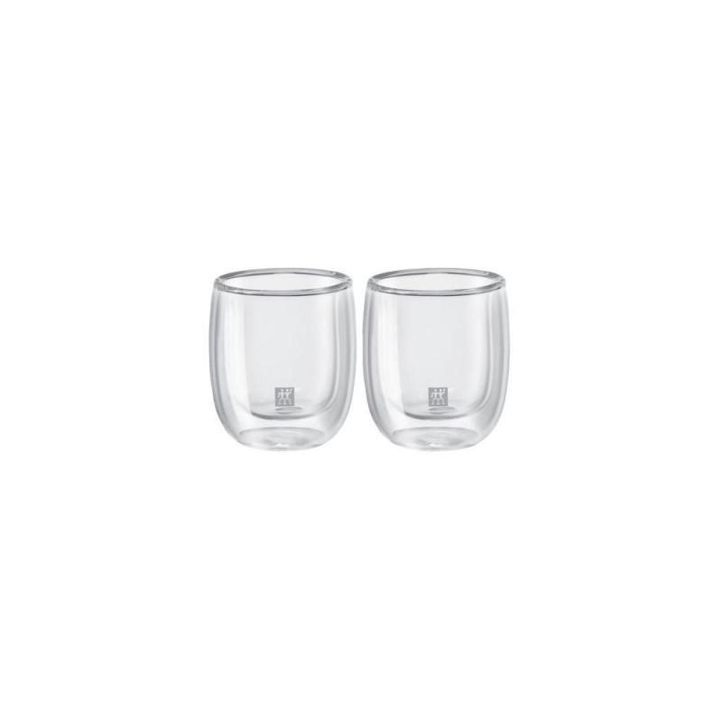 The high-quality espresso glasses from ZWILLING SORRENTO series leave nothing to be desired for lovers of Italian coffee specialities. Whether in the early morning, after lunch or simply in between: The special design sets new standards for stylish coffee drinking. The high quality of the glasses is demonstrated, among other things, by the fact that each glass is handcrafted and mouth-blown. The borosilicate glass used is not only durable, but also particularly heat-resistant. While the low weight of the glasses makes them pleasant to hold, the double-walled design has several advantages. Both cold and hot drinks retain the desired temperature for longer - just as espresso should. At the same time, fingers are protected from burns. With the double-walled espresso glasses, in which the coffee seems to float, sophisticated functionality meets exceptional design.ZWILLING 39500-075. Product colour: Transparent, Material: Borosilicate glass, Form factor: Round. Volume: 80 ml, Width: 63 mm, Depth: 63 mm