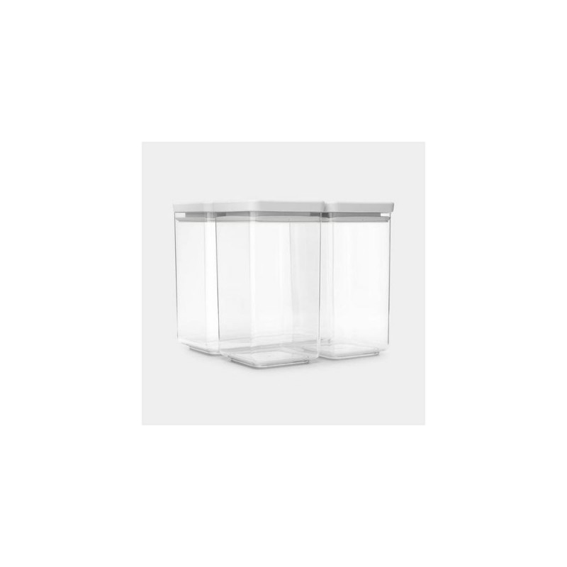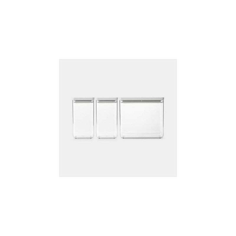 Keeping an organised kitchen can be challenging at times. Brabantia is happy to be of help with this set of three plastic Tasty+ Stackable Canisters - one 3.5L and two 1.6L containers. Their strong and space efficient design shows contents at a glance. Ideal to keep stock in sight and food fresh for longer. Space saving organisers in BPA-free plastic.<br>Brabantia Tasty+. Type: Canister, Form factor: Rectangular, Capacity: 6.7 L. Package width: 201 mm, Package depth: 111 mm, Package height: 441 mm. Quantity per pack: 3 pc(s)