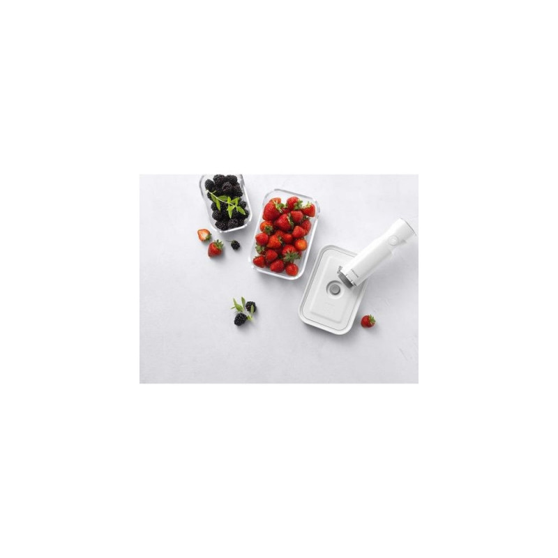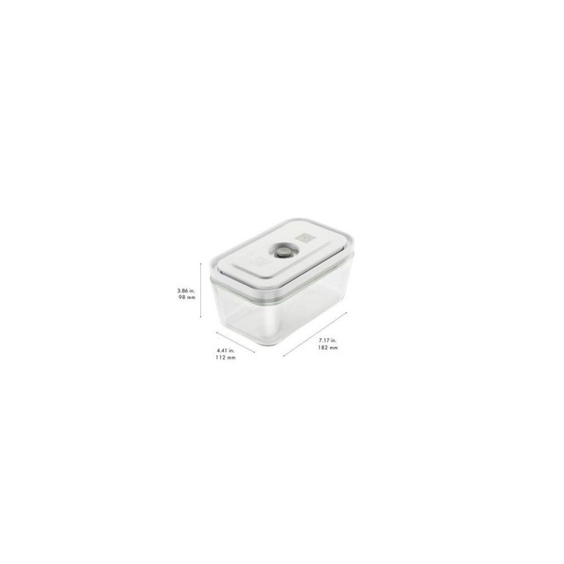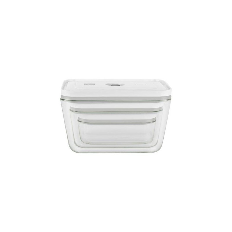 Meal prep made easy.<br><br>The FRESH & SAVE vacuum containers are designed to work with the vacuum pump to keep food fresh up to five times longer than non-vacuum storage. The borosilicate glass containers are stackable and freezer, microwave (without vacuum seal), and dishwasher safe. Glass containers are ovenproof (without lid) to 180°C and double as beautiful serving pieces at the table. Each container style is available in a range of sizes so you can store an entire leftover dinner, a light lunch, or a small to-go snack.<br><br>With the FRESH & SAVE system, you can shop once a week and refrigerate or freeze fresh fruit, vegetables, meat, and fish in our vacuum containers and bags and enjoy the benefits of your own fresh market at home. Prepare your meals days in advance and enjoy them as fresh as the day they were cooked. Cook meat sous vide or marinate meat for the grill in just 30 minutes in the vacuum bags and containers.<br><br>Here's how it works: Dock the vacuum pump (sold separately, item 36801-000-0) onto the container or bag valve and at the push of a button it extracts the air in mere seconds. It stops automatically once a sufficient vacuum has been obtained, locking in flavour, aromas, and vitamins.<br><br>Size details:<br><br>Glass container, small (individual item 36803-100-0) Dimensions: 15.5cm length, 8.5cm width, 7cm height. Weight: 425g Maximum filling capacity: 0.35 litres<br><br>Glass container, medium (individual item 36803-200-0) Dimensions: 18cm length, 11cm width, 10cm height Weight: 794g Maximum filling capacity: 0.75 litres<br><br>Glass container, large (individual item 36803-300-0) Dimensions: 21cm length, 14cm width, 13cm height. Weight: 1260g Maximum filling capacity: 1.6 litresZWILLING FRESH & SAVE. Type: Box, Form factor: Rectangular, Product colour: Grey, Transparent. Food storage container 1 weight: 425 g, Food storage container 2 weight: 794 g, Food storage container 3 weight: 1.26 kg. Quantity per pack: 3 pc(s)