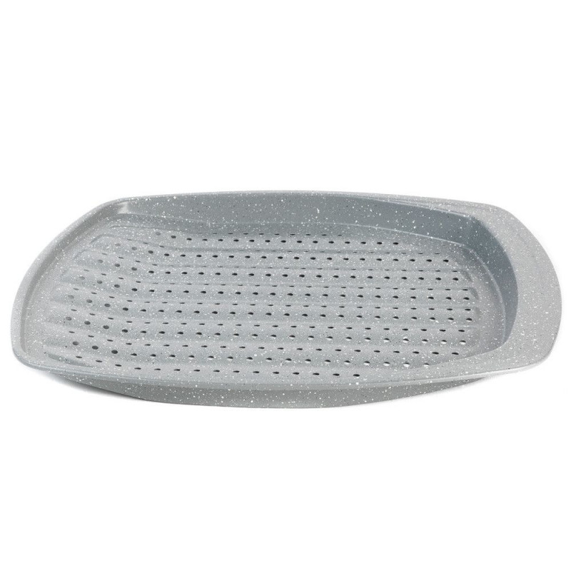 Marmoriefekt: Igal Marblestone'i küpsetusvormil on hall viimistlus ja täpiline marmormustrid, mis sobivad ideaalselt uue kollektsiooni loomiseks või olemasolevate köögitarvete täiendamiseks. Mitmekülgne toiduvalmistamine: Kõrgendatud servadega, et toit hästi säiliks, perforeeritud põhi tagab eriti krõbeda tulemuse ja seda saab kasutada mitmesuguste roogade, sealhulgas friikartulite, kartuliviilude, küpsiste, röstitud köögiviljade ja muu valmistamiseks! Süsinikteras: Vastupidavast tugevast süsinikterasest valmistatud vorm on kerge ja disainitud nii, et seda on lihtne ahju panna ja ahjust välja võtta. Mittenakkuv pind: Mittenakkuv kate võimaldab toitu hõlpsalt jääke jätmata vabastada, mis sobib ideaalselt muretuks puhastamiseks! See vorm on ka PFOA-vaba ohutuks ja tervislikuks toiduvalmistamiseks! Ahjukindel: See vorm on loodud toidu ühtlaseks kuumutamiseks, et saavutada iga kord ideaalsed küpsetustulemused, ja seda saab ahjukindlalt kasutada kuni 220 °C juures.Toote spetsifikatsioon Värv: hall Suurus: 2,7 x 33,8 x 39 cm Valik: marmorist kivi Tüüp: laastualus Mittenakkuv kate: jah Materjal: süsinikteras Nõudepesumasinas pestav: ei Metallist köögiriistade jaoks ohutu: ei