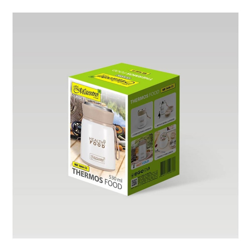 The Dinner thermos Maestro MR-1646-80 has a capacity of 800 ml and is made of silicone and stainless steel. It features vacuum insulation and includes a bowl and spoon.Osta kohe, viimased eksemplarid laos!