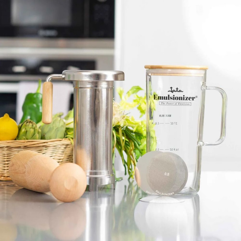 Roostevabast terasest emulgeeriv filter Lahti keeratav vahetatavate ketastega Sellega saab valmistada taimepiima, mahla, suppe, puljonge, kastmeid, vinegrette jne. Komplektis: lahti keeratava alusega filter terastoruvõrguga, 3 terasketast ja 1 puidust uhmer Lihtne puhastada