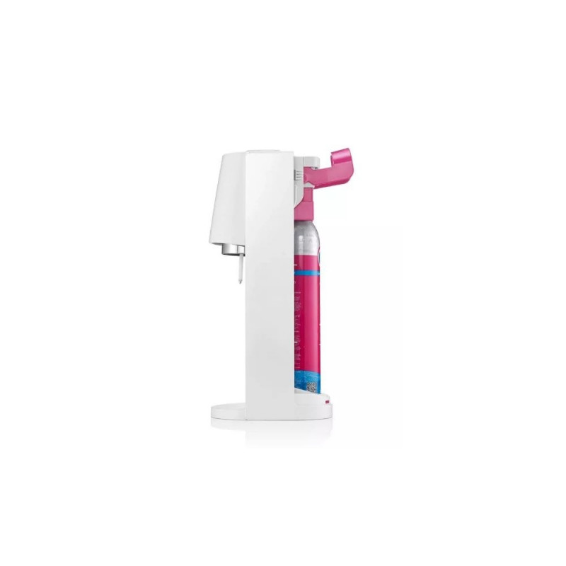 The SodaStream Terra soda maker allows you to easily carbonate water at home and enjoy refreshing fizzy drinks anytime. Its sleek and intuitive design makes operation simple: just fill the included bottle with cold water, insert it into the machine, and press the carbonation button to achieve your preferred level of fizziness. The Terra model features a sturdy build, tool-free cylinder installation, and an easy-to-use carbonation mechanism. Enjoy healthier homemade sparkling water and reduce single-use plastic waste with this efficient and stylish appliance in white.