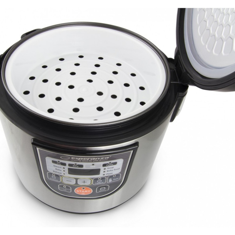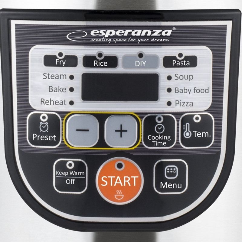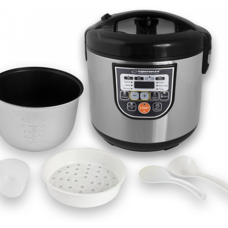 Esperanza Multicooker on suurepärane abiline köögis ja pakub mitmeid eeliseid. Sellel on palju erinevaid toiduvalmistamise funktsioone, nagu elektriline pann, sügavküpsetaja, toiduauruti ning kookide ja leiva küpsetaja. Seade on energiasäästlik, säästab köögis ruumi ja vähendab märkimisväärselt toiduvalmistamise aega. Tänu lihtsale ja intuitiivsele LCD-ekraanile on funktsionaalsete programmide seadistamine ja toiduvalmistamise aja reguleerimine lihtne. Meie multicookeriga saate valmistada kõiki oma lemmikroogasid kiiremini ja tervislikumalt! Head isu!
