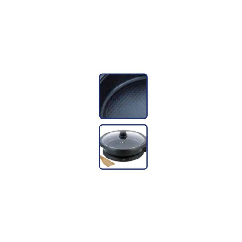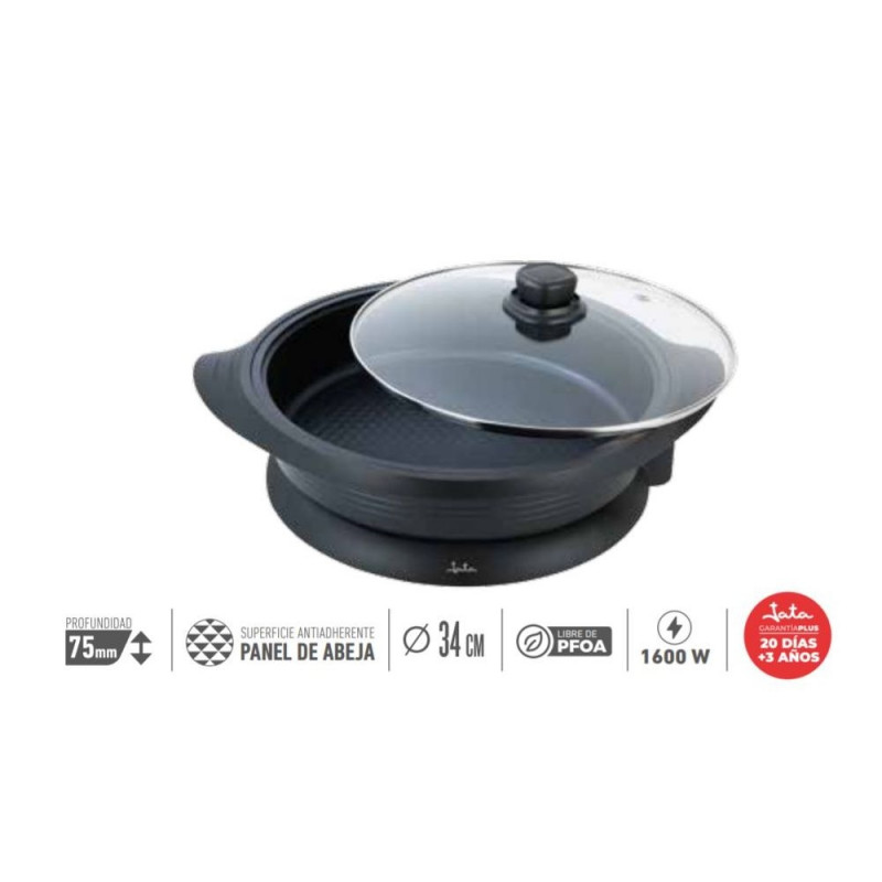 • Läbimõõt 34 cm. • Sügavus 75 mm. • PFOA-vaba kate. • Kärgpind: parandab kleepumatust ja ühtlast soojusülekannet. • Reguleeritav eemaldatav termostaat. • Klaasist kate. • Auruga väljalaskeklapp. • Soojusisolatsiooniga käepidemed. • Kaasaskantav lauas. • Lihtne puhastada. • Lisatud spaatlit. • Mõõdud: 41,4 x 30,4 x 43,2 cm • Kaal: 4,14 kg