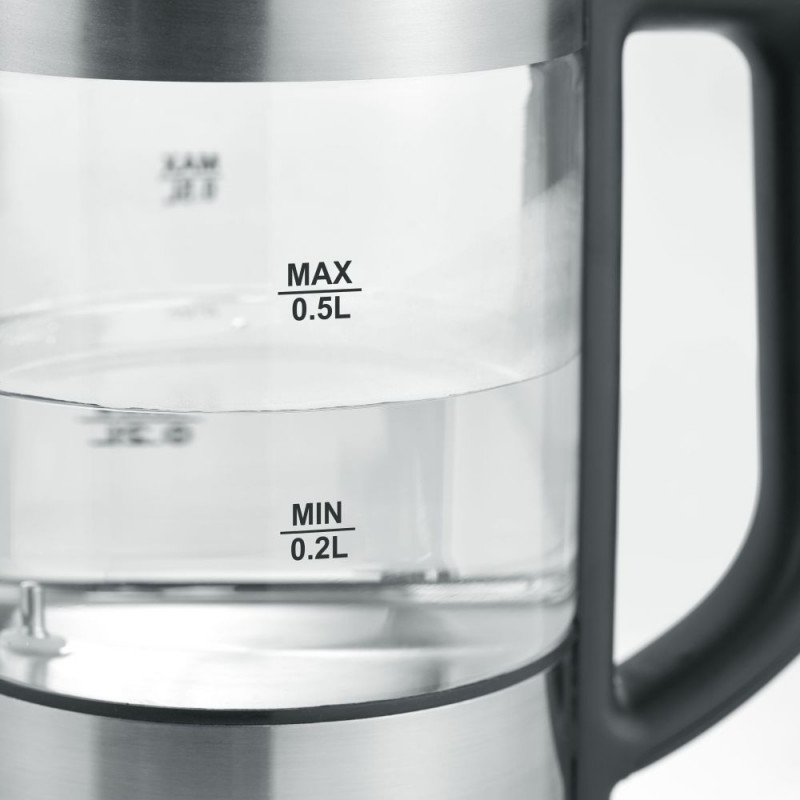 · Kompaktne miniklaasist veekeetja mahuga 0,5 l – ideaalne väikestele majapidamistele, säästab hoiuruumi ja vähendab veetarbimist · 100% BPA-vaba loomuliku ja täiesti tervisliku toidu nautimiseks · Individuaalsed temperatuuri seadistused vahemikus 40° – 100° C, reguleeritavad 5° C sammuga soojashoidmise funktsiooniga · Ergonoomilise disainiga käepide praktiliseks ühe käega töötamiseks · Tänu mõlemale küljele trükitud veetaseme indikaatorile sobib see suurepäraselt ka parema- ja vasakukäelistele kasutajateleVÕIMSUS 1100 vatti KAABLI PIKKUS - 700mm MÕÕDUD- 10,8 × 17,3 × 19,5 cm KAAL - 0,834 kg