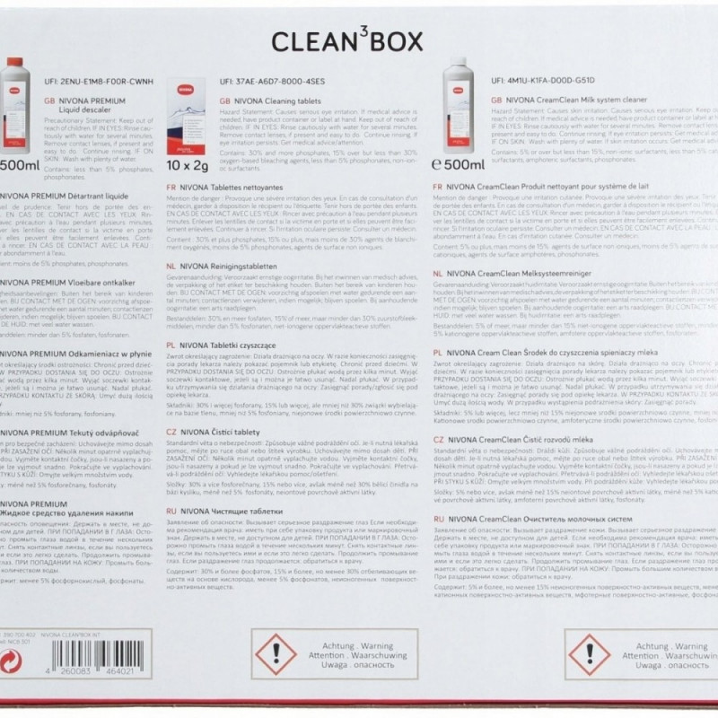 Täielik puhtus ühes karbis: CLEANBOX sisaldab kõike, mida vajate oma NIVONA kohvimasina puhastamiseks - PREMIUM vedel desinfitseerimisvahend, CreamClean piimavahustaja puhastusvahend ja puhastustabletid.