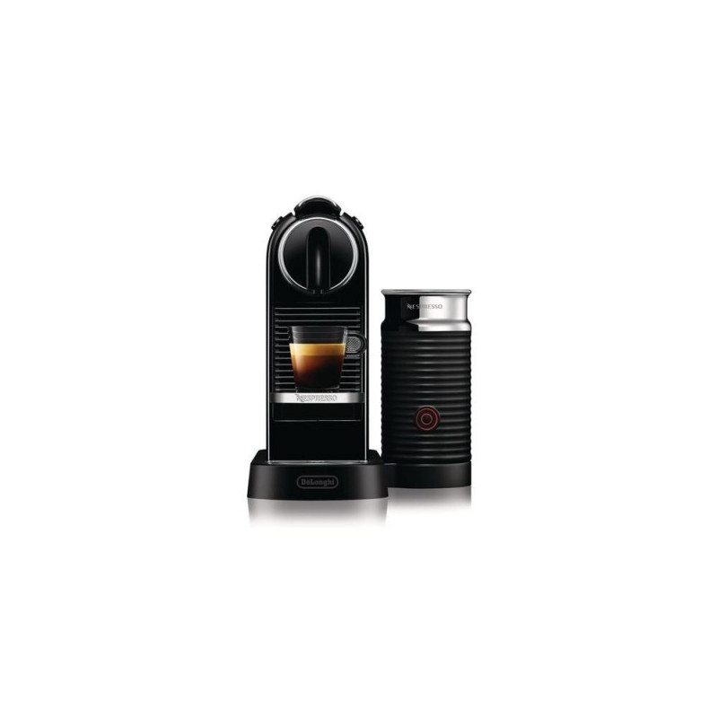 - Automatic brewing unit<br>- Integrated Aeroccino milk frother to prepare delicious cappuccino<br>- 19 bar pressure pump<br>- Thermoblock heating element <br>- (heat up time 25 sec.)<br>- Auto stand-by after 9 minutes<br>- Energy Class A-40%<br>- FLOW STOP: Automatic and programmable Coffee Quantity<br>- Settings: 40 ml for Espresso and 110 ml for Lungo<br>- Easy introduction of capsules<br>- Mechanic ejection of capsules.<br>- Capsule container for 9-11 used capsules<br>- Water tank 1 literDe’Longhi Citiz. Product type: Drip coffee maker, Coffee maker type: Semi-auto, Water tank capacity: 1 L, Coffee input type: Coffee capsule. Power: 1710 W. Product colour: Black