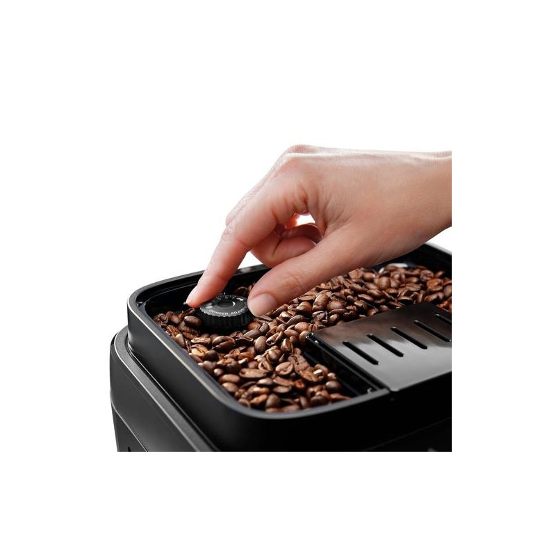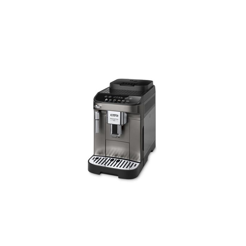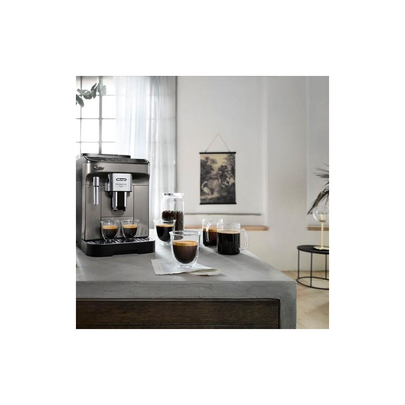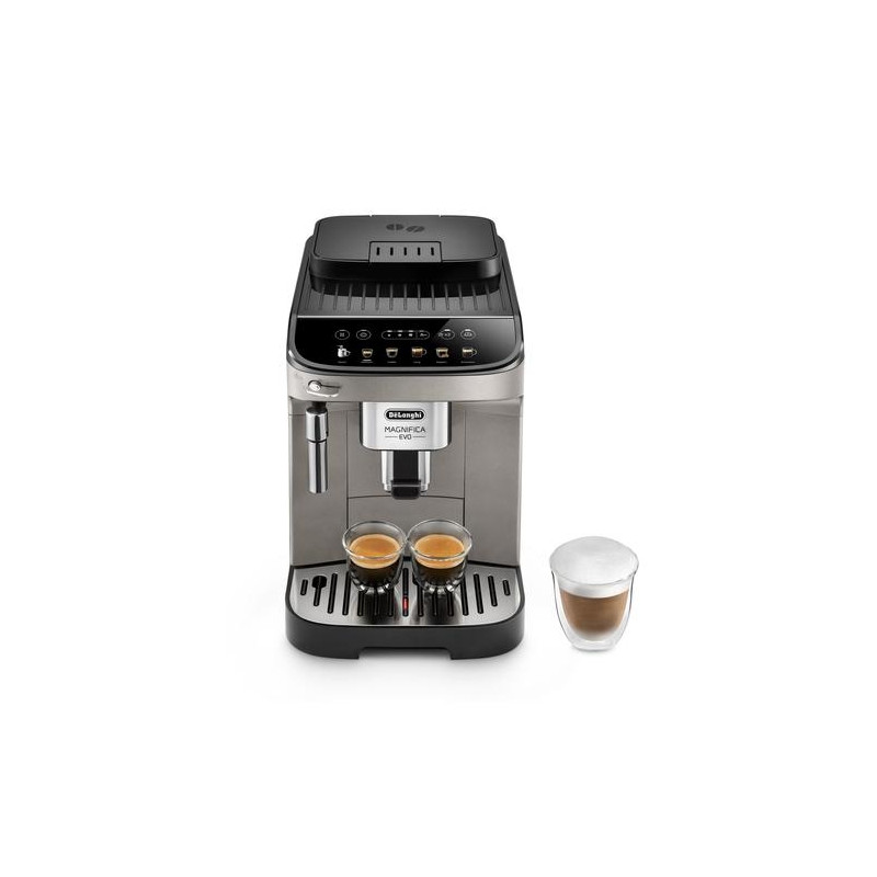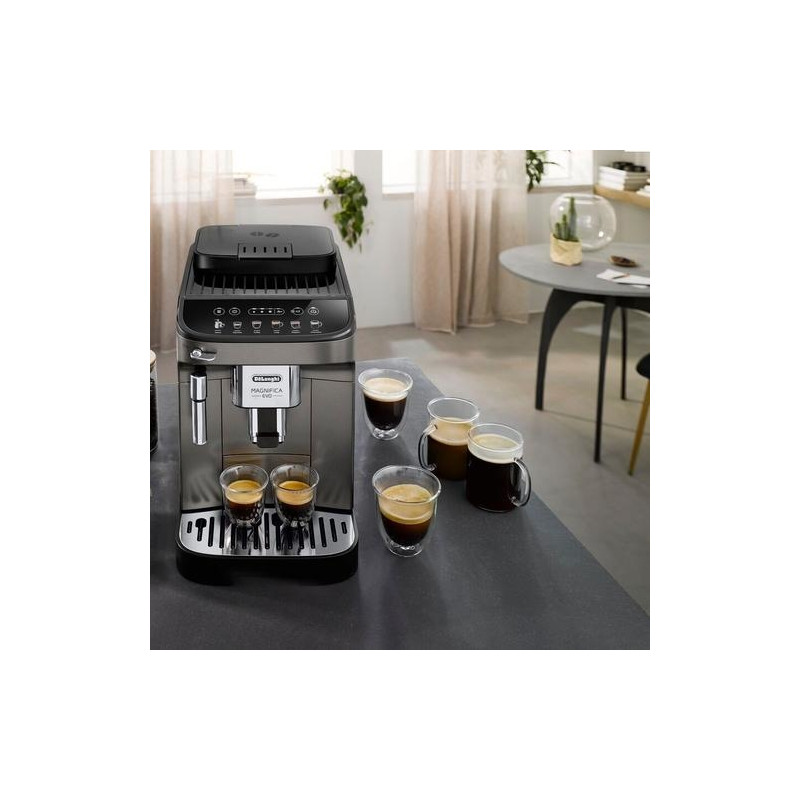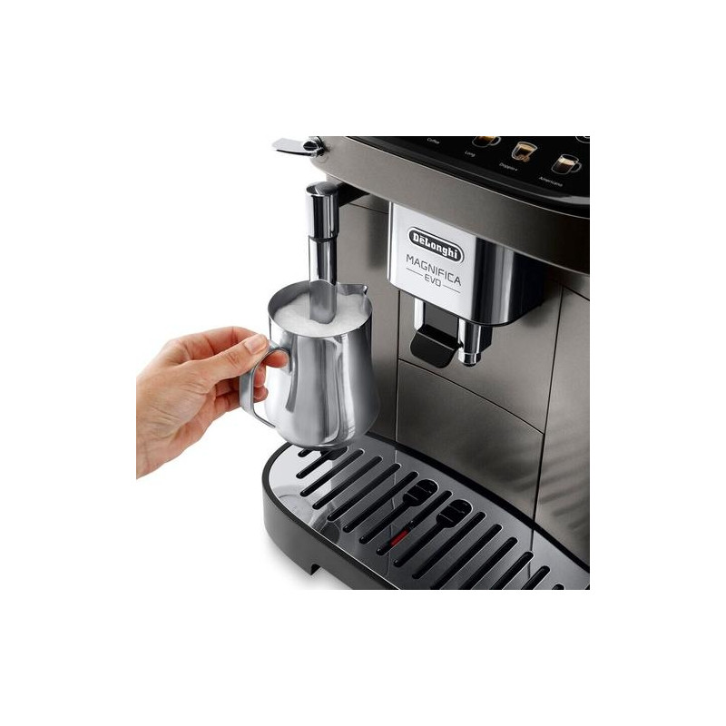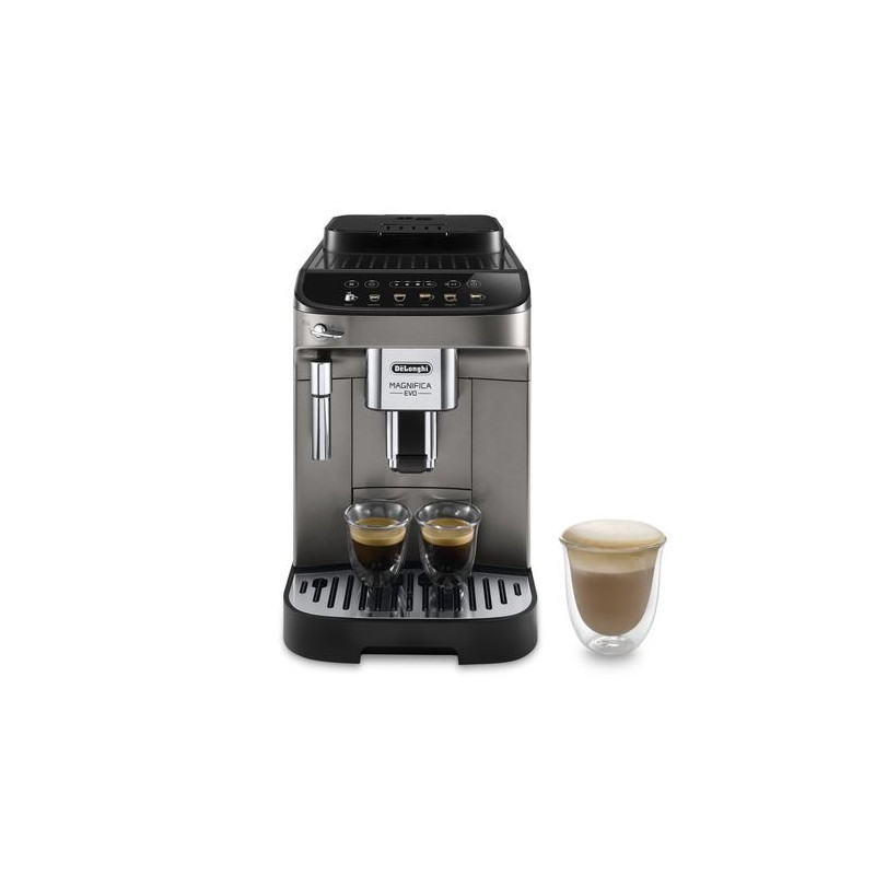 Macchina automatica per caffè in chicchi, cappuccinatore manuale, pannello comandi ad icone colorate, 6 bevande dirette (Espresso, Coffee, Doppio+, Long, Americano, Vapore), funzionamento con grani e con polvere, macinacaffè regolabile fino a 13 livelli di macinatura, regolazione della temperatura, della quantità di caffè e di acqua, Thermoblock, durezza dell’acqua e spegnimento automatico programmabili, vaschetta raccogligocce anti graffio, colore titanium/black.De’Longhi Magnifica Evo. Product type: Espresso machine, Coffee maker type: Fully-auto, Water tank capacity: 1.8 L, Coffee input type: Coffee beans, Ground coffee, Reservoir for brewed coffee: Cup, Capacity in cups: 2 cups. Power: 1450 W. Product colour: Black, Titanium
