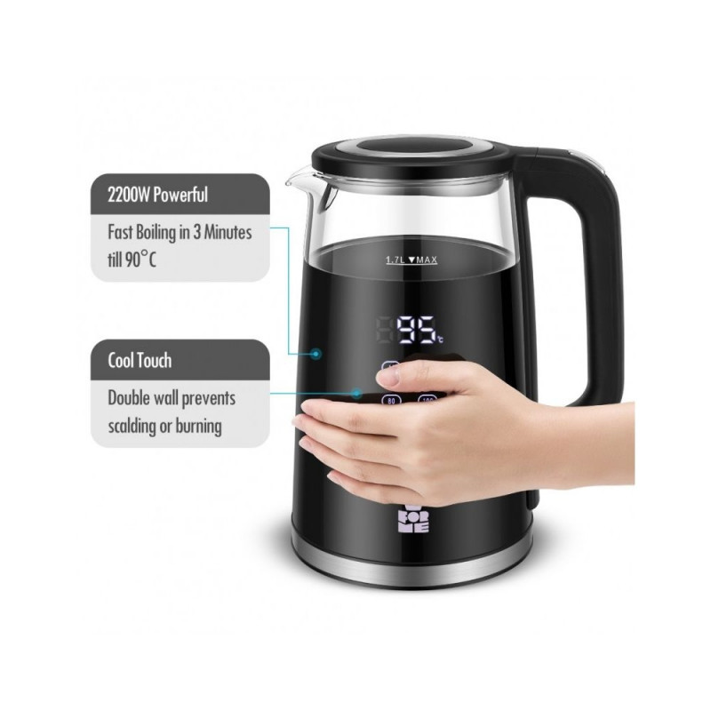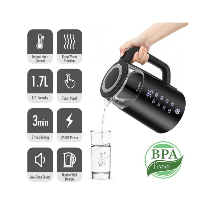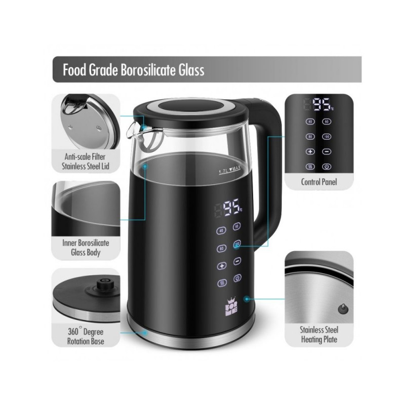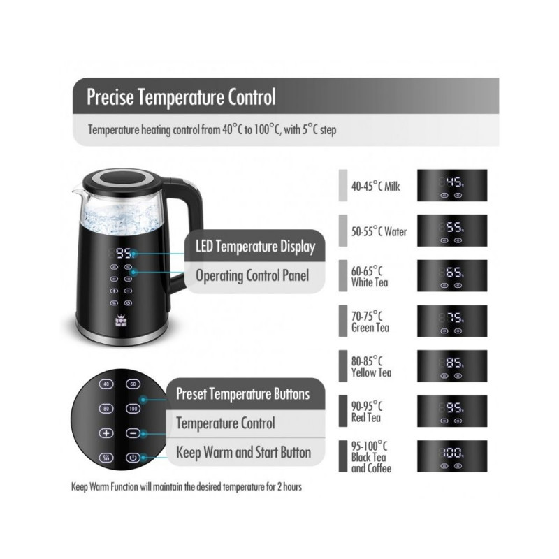 Funktsioonid Suur digitaalne temperatuuriekraan Neli nuppu nelja eelseadistatud temperatuuri jaoks Temperatuuri valik vahemikus 40-100°C 5°C sammuga Automaatne sooja hoidmise funktsioon pärast keetmist Automaatne ooterežiim energia säästmiseks Näitab tegelikku veetemperatuuri Peidetud SUS304 roostevabast terasest kütteelement Kahekordne seinakonstruktsioon, klaasist sisekiht plastikust väliskihigaTehnilised andmed Nimivõimsus: 220-240V, 2200 W Korpus: klaas Värv: must Mahutavus: 1,7L Toitejuhtme pikkus: nähtav 70-75cm Temperatuuri reguleerimine: Jah Kütteelement: roostevaba teras, peidetud Temperatuurivahemik: 40-45-50-55-60-65-70-75-80-85-90-95-100 Veetaseme indikaator: Jah Sooja hoidmise funktsioon: Jah Automaatne väljalülitus: jah Helisignaal: jah Ülekuumenemiskaitse: Jah Katlakivivastane filter: jah Juhtme hoidmine: Jah Mõõdud: 27 x 21 x 16 cm