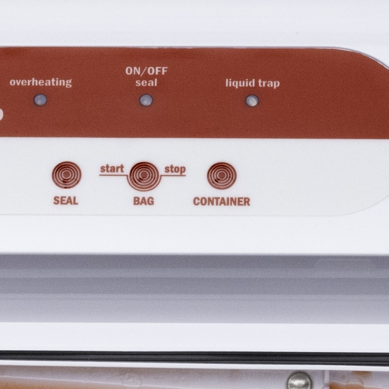 - käsitsi vakuumipakendamise funktsioon niisketele ja õrnadele toiduainetele (värske liha, puuviljad ja köögiviljad). Kasutades käivitamise ja peatamise funktsioone, peatab kasutaja pumba, kuni vedelik imendub vaakumikanalisse või enne purustatud toiduainet.