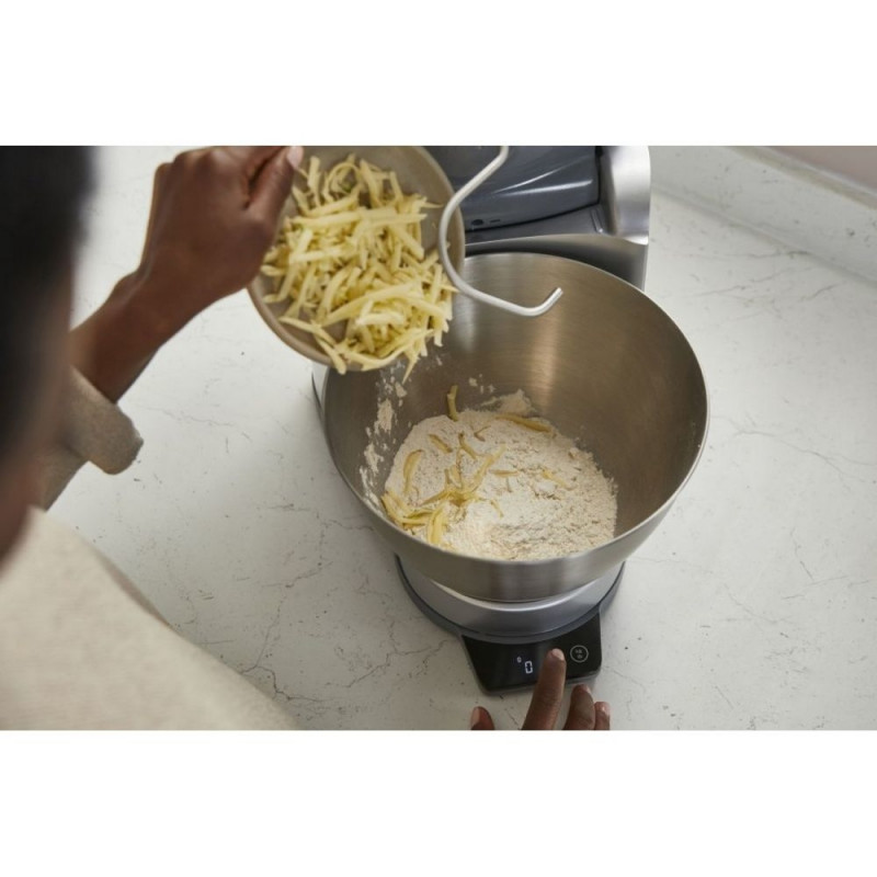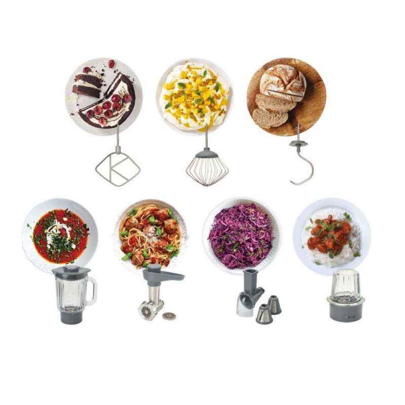 Komplektis | Kannmikser, lõikur, tsitruspress, K-segur, pallvispel, taignakonks, 3 riiv-/lõikeketast |