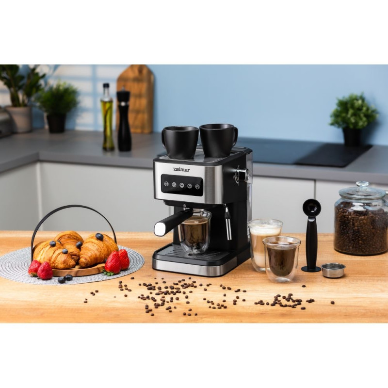 Võimsus: 1050 W Rõhk: 20 baari Küttesüsteem: boiler Piimavahustamissüsteem: otsik Kohvi tüüp: jahvatatud, kaunad Joogitüübid: Double Espresso, Espresso Kahe kohvi keetmine korraga: Jah Eemaldatav tilkumisalus: jah Eemaldatav veepaak: jah Veepaagi maht: 1,5 l Tassi soojendamine: Jah Filtrite arv: 2 Ekraani tüüp: LCD Puutepaneel: jah Automaatse väljalülituse funktsioon: Jah Korpuse materjal: kvaliteetne plastik ja roostevaba teras Lisafunktsioonid: 5 nuppu: 1 tass, 2 tassi, sisse/välja, käsitsi juhtimine, kuum vesi ja aur