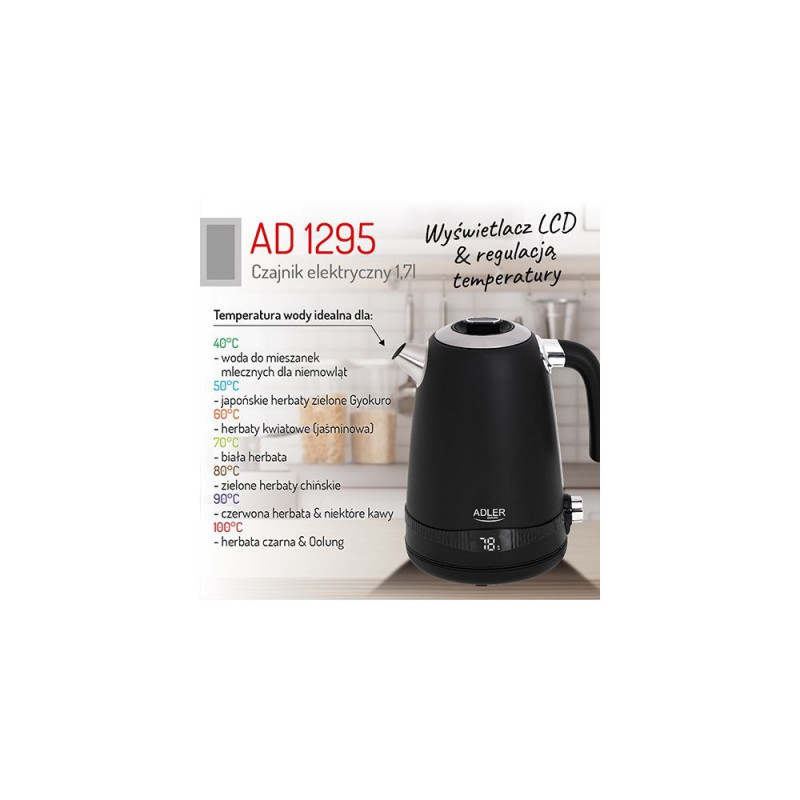 Muud vee temperatuuri seaded võimaldavad kohandada seda iga joogi jaoks. Veekeetja on valmistatud kõrgekvaliteedilisest roostevabast terasest, varustatud katlakivivastase filtri ja ülekuumenemiskaitsega, mis tagab seadme pikaajalise kasutamise. Mudeli ADLER AD 1295 sisemuse lihtsaks puhastamiseks on see varustatud täielikult eemaldatava kaanega ilma hingedeta.