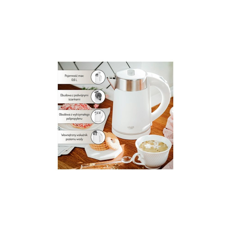 Tõhus ja energiasäästlik 0,6 L mahutavusega veekeetja, mis võimaldab kiiresti keeta vett kohvi või tee jaoks kahele inimesele. Väikesed mõõtmed ja madal energiatarve teevad sellest suurepärase valiku reisijatele või neile, kes hindavad säästlikkust. Mini veekeetja on väga mugav tänu stabiilsele alusele ja kontrolltulele. See hoiab ära tarbetu energiakulu - piisab 200 ml veest, et vesi keema ajada. Pärast vee keemaminekut lülitub automaatselt välja, tagades kasutaja ohutuse.