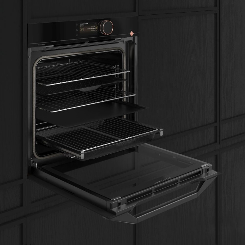 Jahe pehmelt sulguv uks tagab muretu ahju käsitluse! 4-kordse tugevdatud klaasiga uks püsib jahe ka kõige kõrgemate temperatuuride juures, isegi pürolüüspuhastuse vältel. Pehmelt sulguvad uksehinged tagavad, et uks sulgub alati vaikselt.