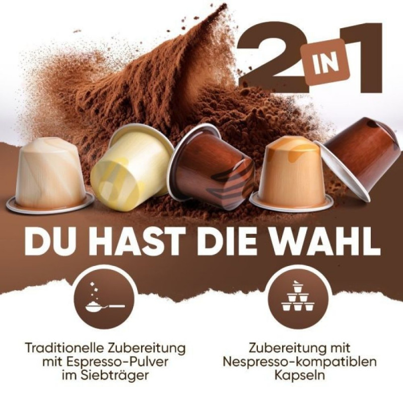 Professionaalne espressomasin koos klassikalise filterkäpaga annab teile võimaluse valmistada kodus maitsvaid kohvijooke, nagu espresso, ristretto, latte macchiato ja palju muud. ProfiCooki kohvimasinad on varustatud originaalse Itaalia professionaalse espressopumbaga, mille töörõhk on kuni 20 bar. Spetsiaalse adapteriga saate kasutada ka Nespressoga ühilduvaid kapsleid. Roostevabast terasest pööratav piimavahustamisfunktsiooniga auruotsik võimaldab valmistada kreemjat cappuccinot ja on puhastamiseks kergesti eemaldatav.