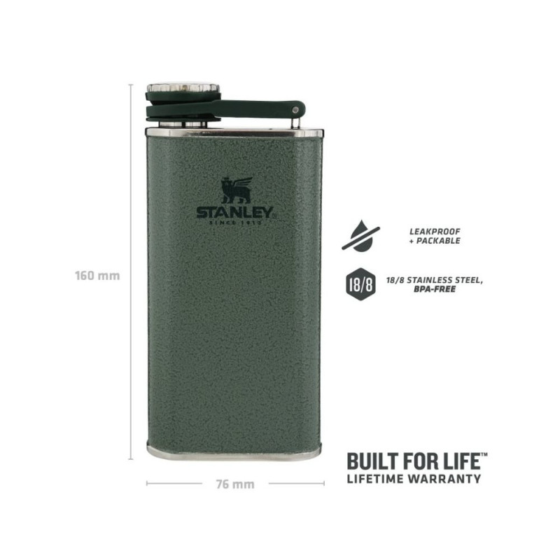 Stanley Classic flask - retro design, compact size, high strength. A wide opening for drinking makes it easy to fill, and the stainless steel design with a leak-proof lid makes it especially durable.