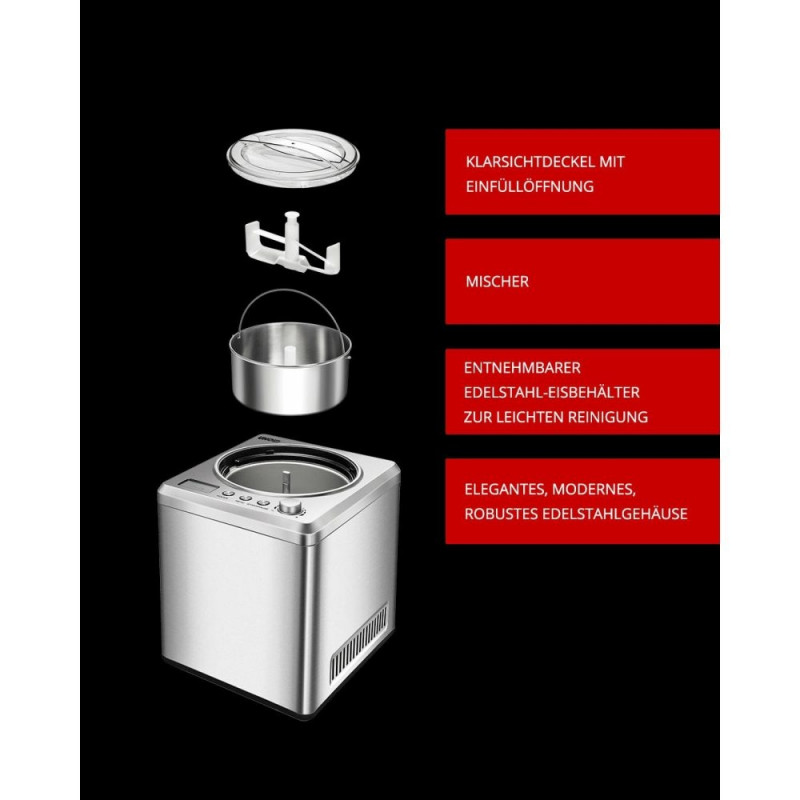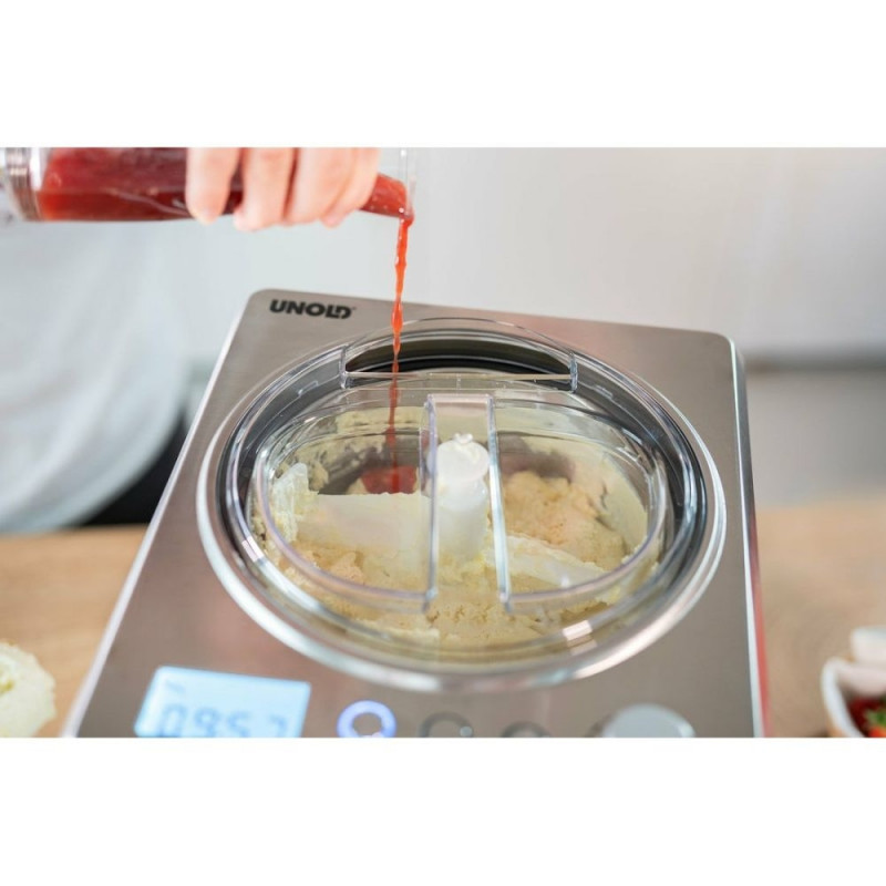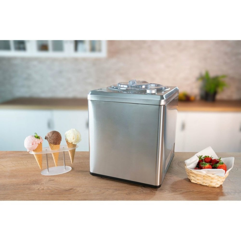 Unold JÄÄMASIN Exklusiv 48872 Tootetüüp: Kompressoriga jäätisemasin, kausi maht: 2 l, kausside arv: 1 anum. Laius: 275 mm, sügavus: 315 mm, kõrgus: 357 mm. Võimsus: 180 W, vahelduvvoolu sisendpinge: 220–240 V, vahelduvvoolu sisendsagedus: 50 Hz. Jäätise tüüp: jäätis, sorbett. Pakendi laius: 384 mm, pakendi sügavus: 323 mm, pakendi kõrgus: 425 mm